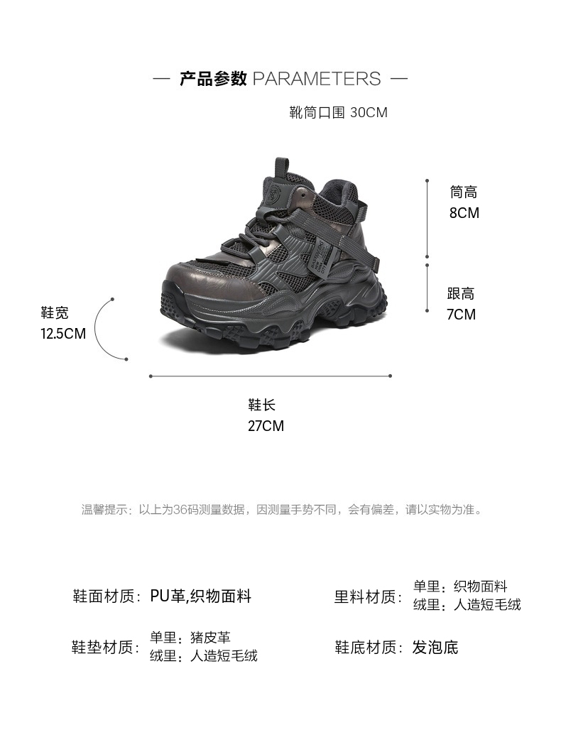 | 鞋底材质:发泡底 | 靴筒内里材质:织物面料 | 内增高:1CM | 鞋面材质:织物面料PU革 | 闭合方式:系带 |