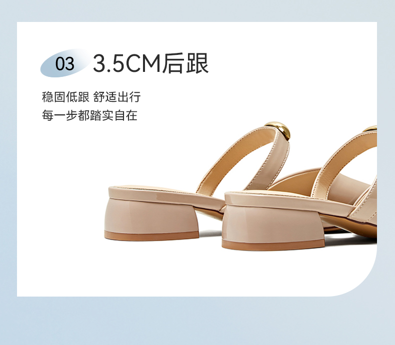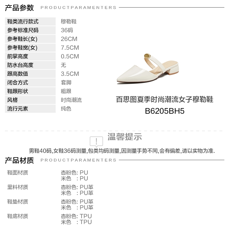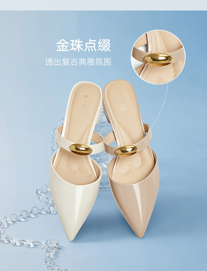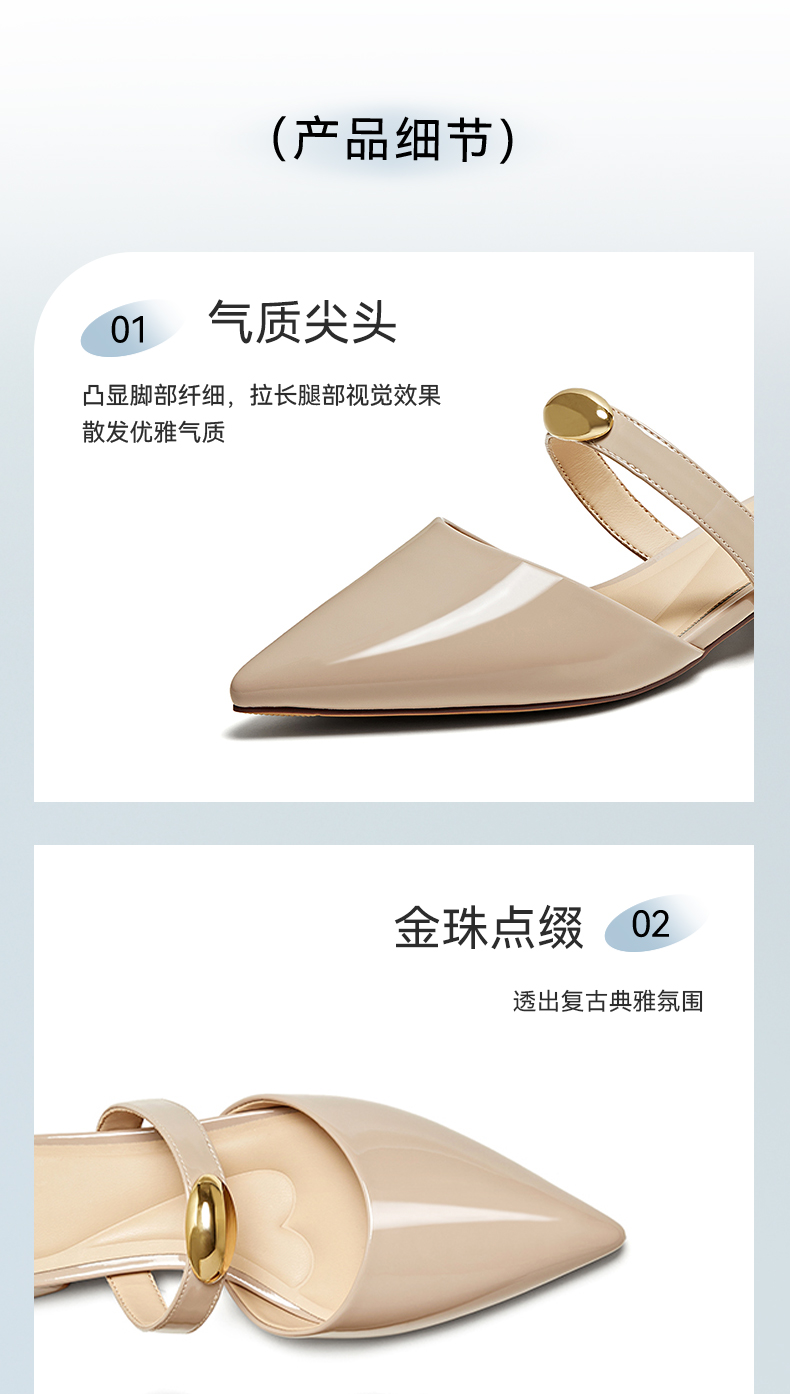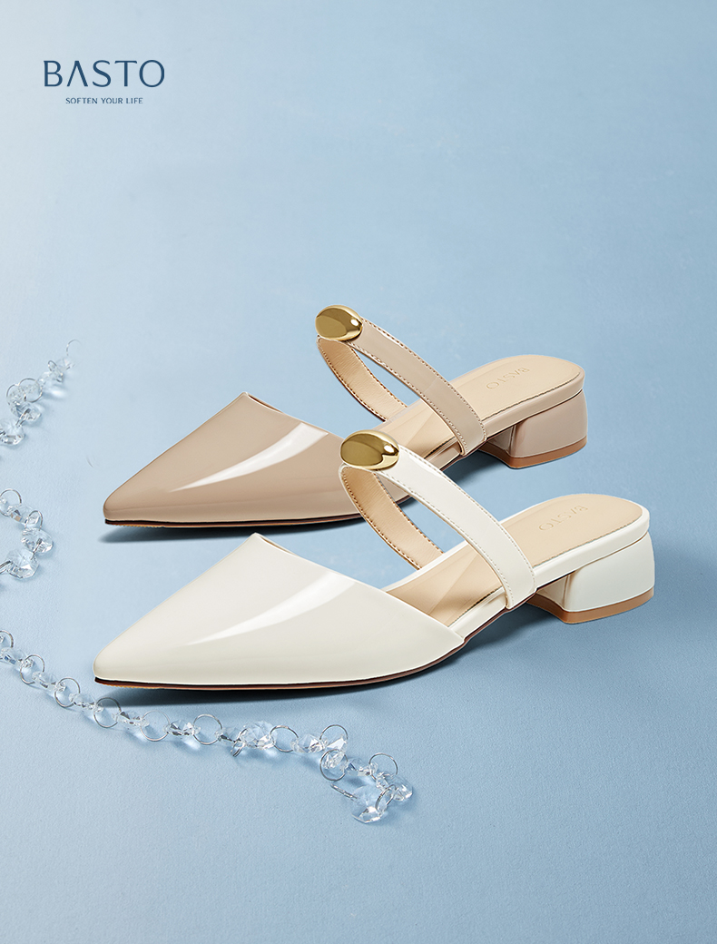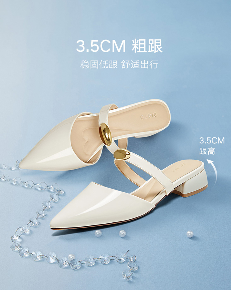 | 鞋类流行款式:穆勒鞋 | 鞋头款式:尖头 | 执行标准:GB/T22756-2017 | 跟高范围:中跟鞋(3-5CM) | 鞋面图案:纯色 |