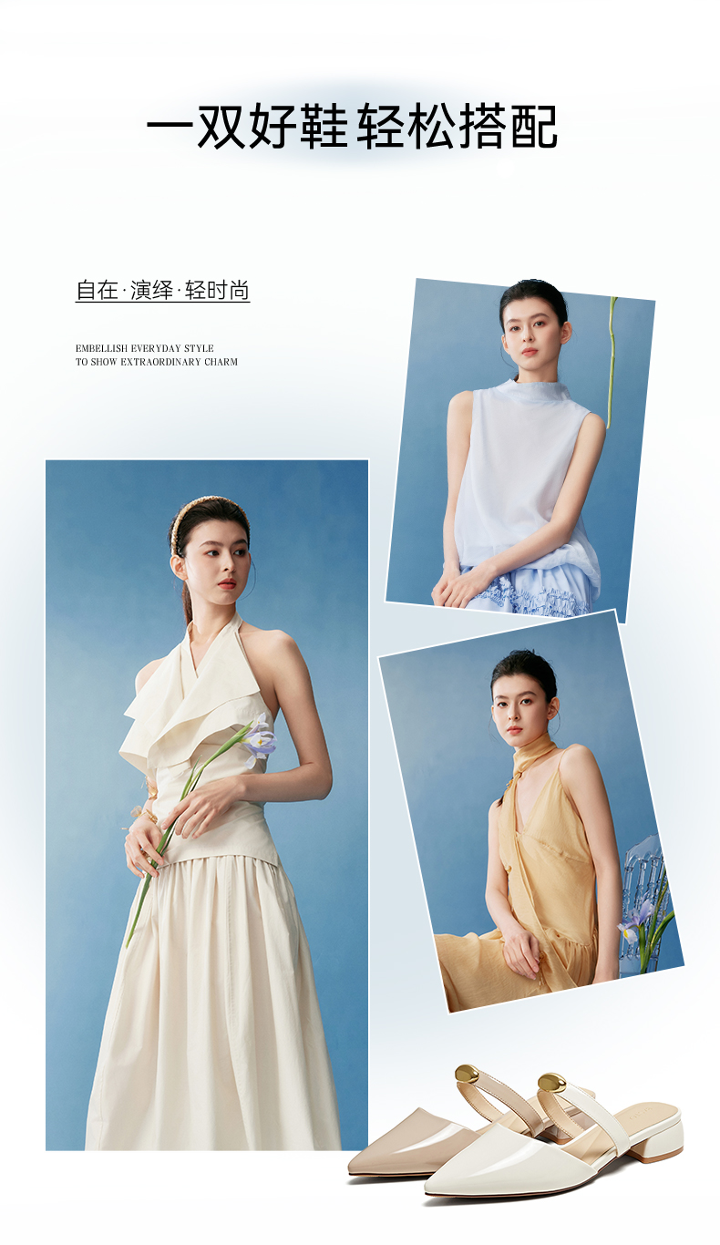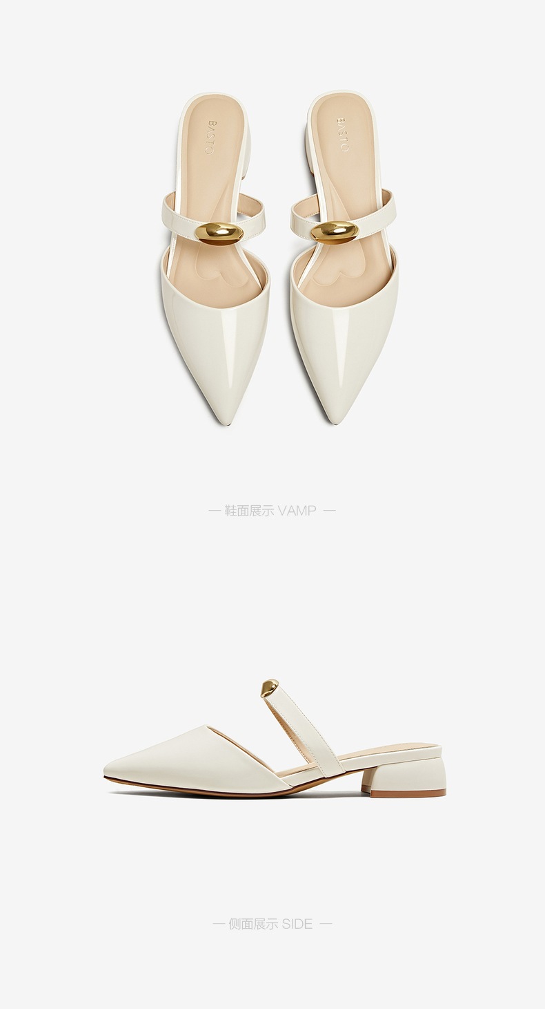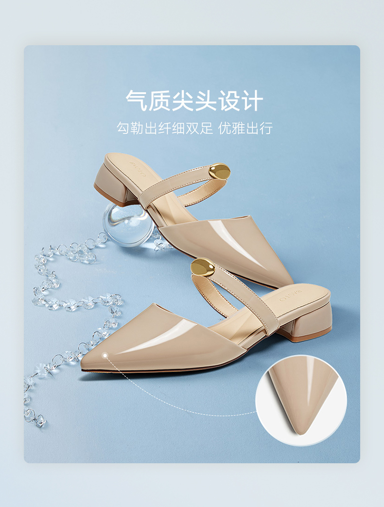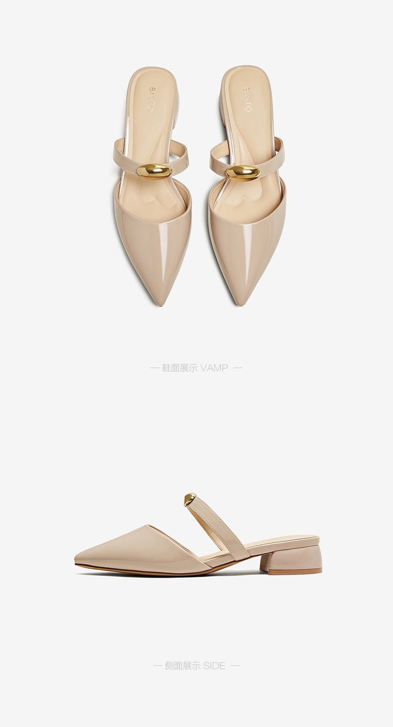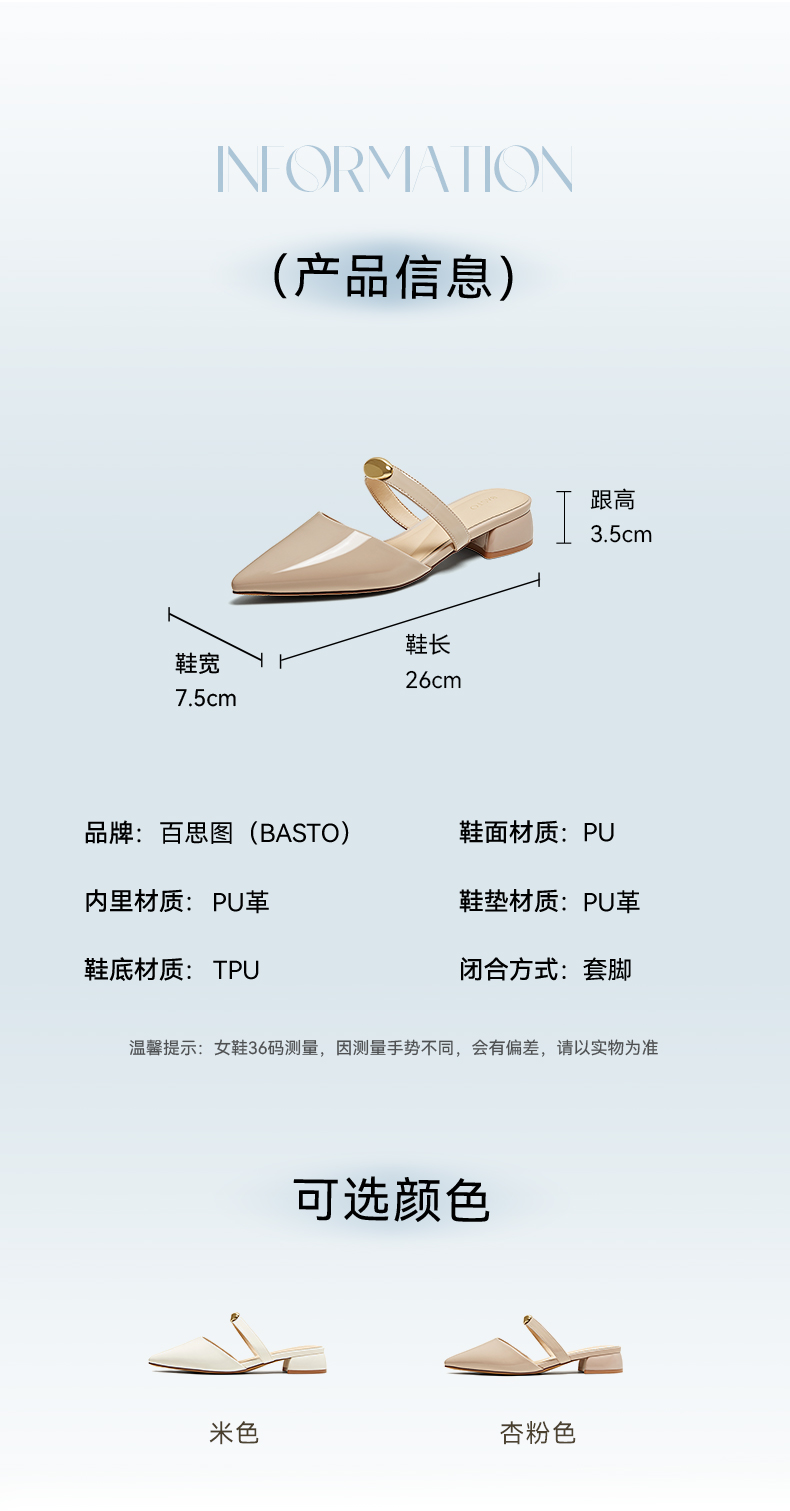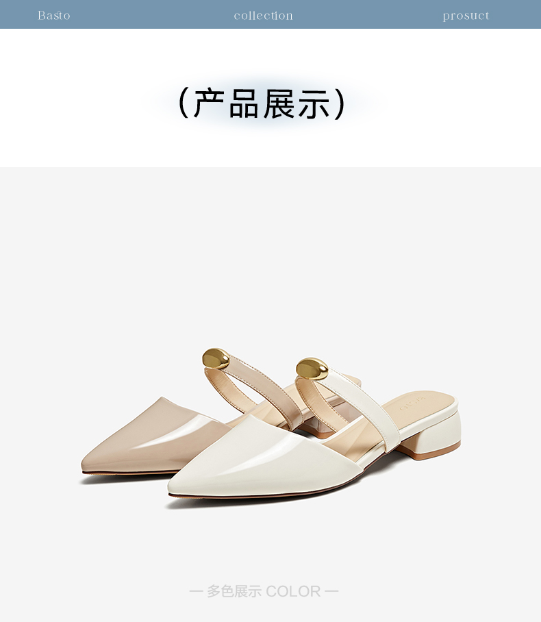 | 鞋类流行款式:穆勒鞋 | 鞋头款式:尖头 | 执行标准:GB/T22756-2017 | 跟高范围:中跟鞋(3-5CM) | 鞋面图案:纯色 |