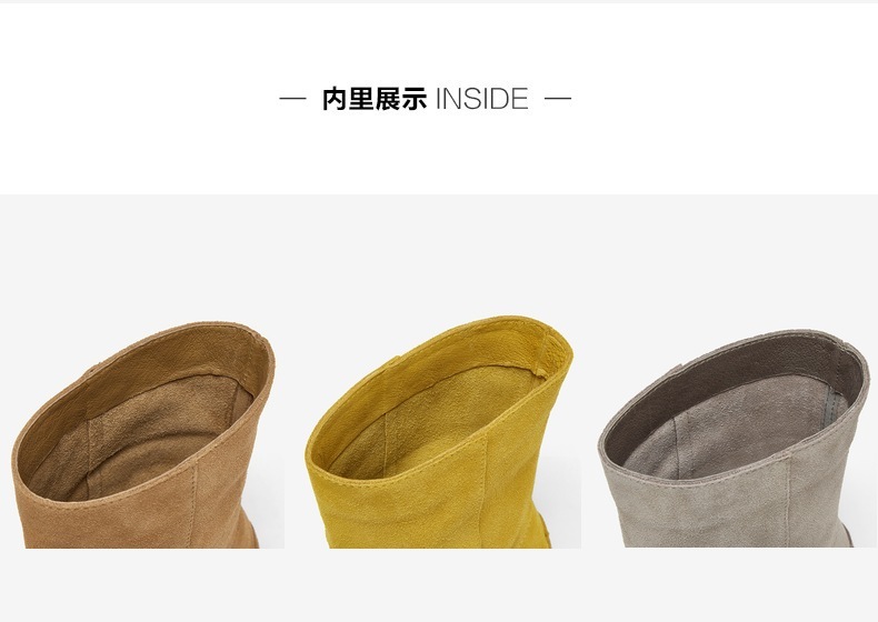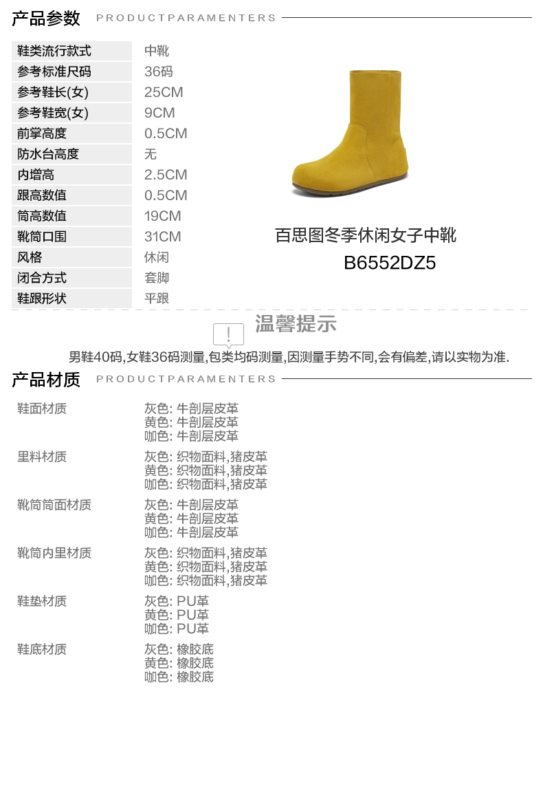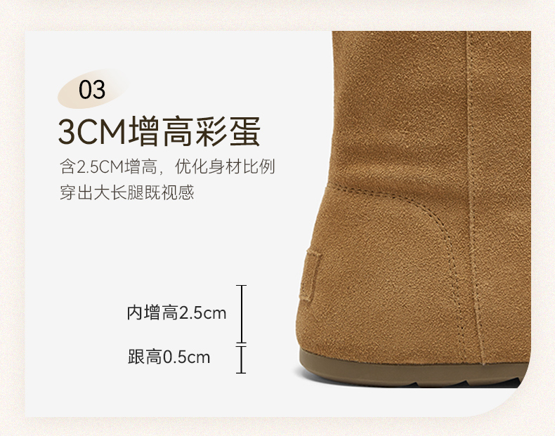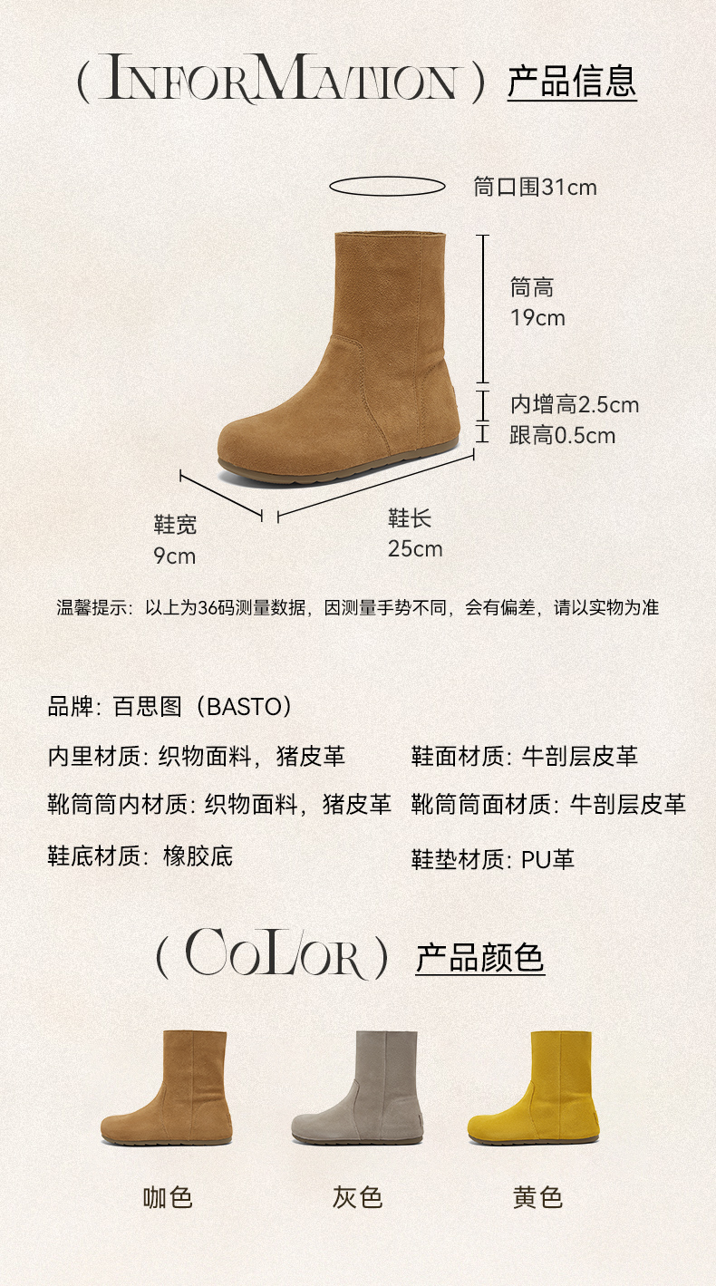 | 鞋底材质:橡胶底 | 靴筒内里材质:猪皮革织物面料 | 内增高:2.5CM | 鞋面材质:牛剖层皮革 | 闭合方式:套脚 |