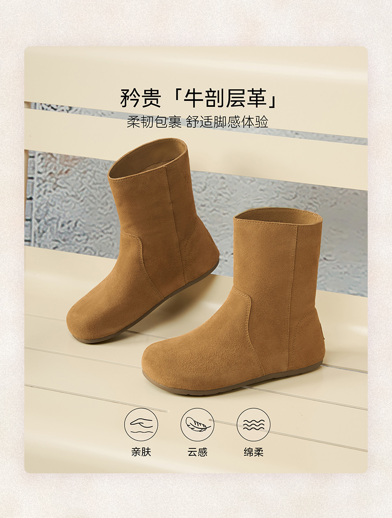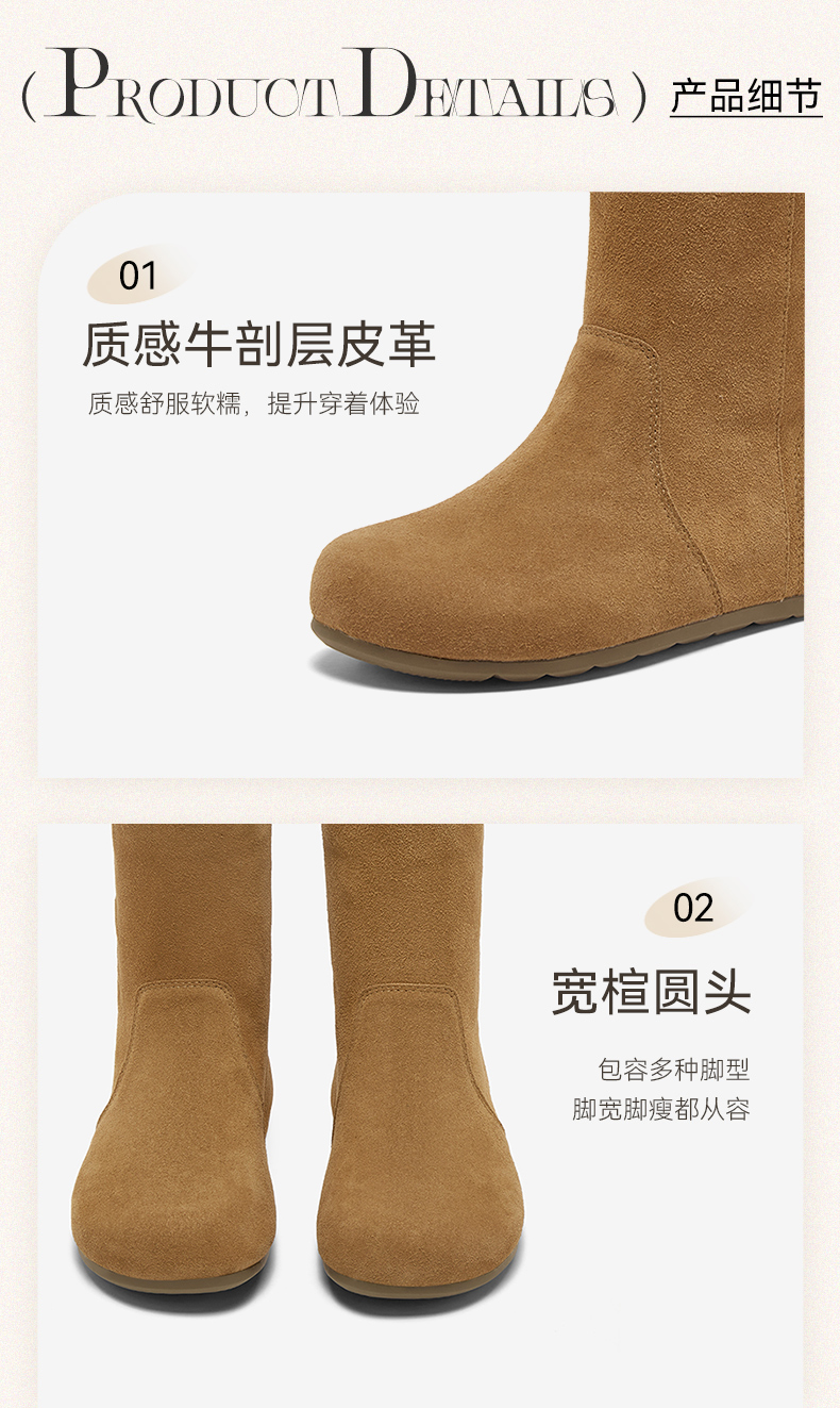 | 靴筒筒面材质:牛剖层皮革 | 里料材质:织物面料猪皮革 | 制鞋工艺:胶贴皮鞋 | 鞋垫材质:PU革 | 款式季节:冬季 |