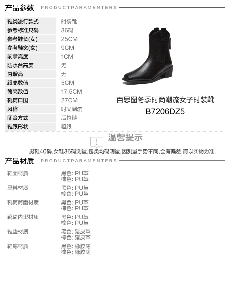 | 鞋底材质:橡胶底 | 靴筒内里材质:PU革 | 内增高:无 | 鞋面材质:PU革 | 闭合方式:后拉链 |
