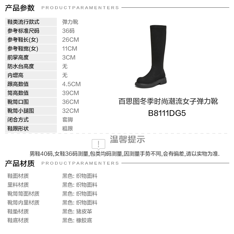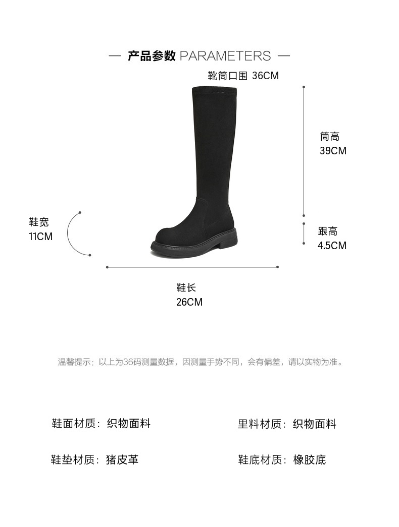 | 配跟:无 | 靴筒口围:36CM | 上市时间:2025年冬季 | 鞋类流行款式:弹力靴 | 鞋头款式:圆头 |