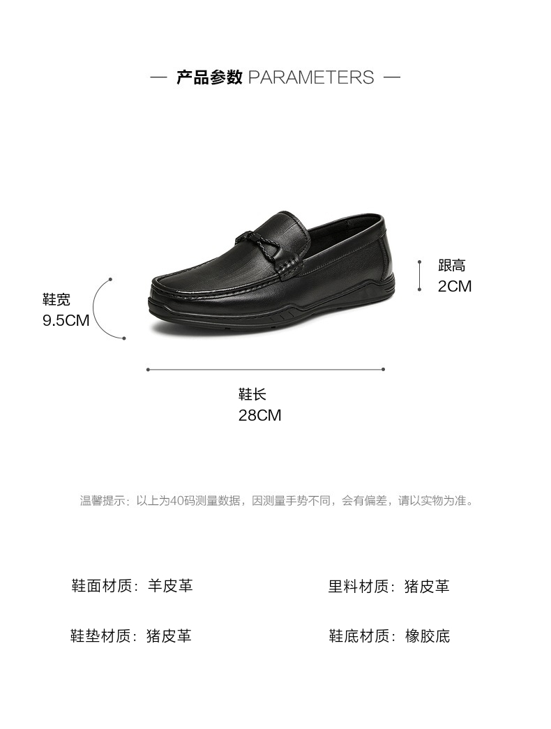 | 鞋面材质:羊皮革 | 适用场合:正装 | 闭合方式:套脚 | 所在区域:电子商务 | 40码鞋宽参考(男):9.5CM |