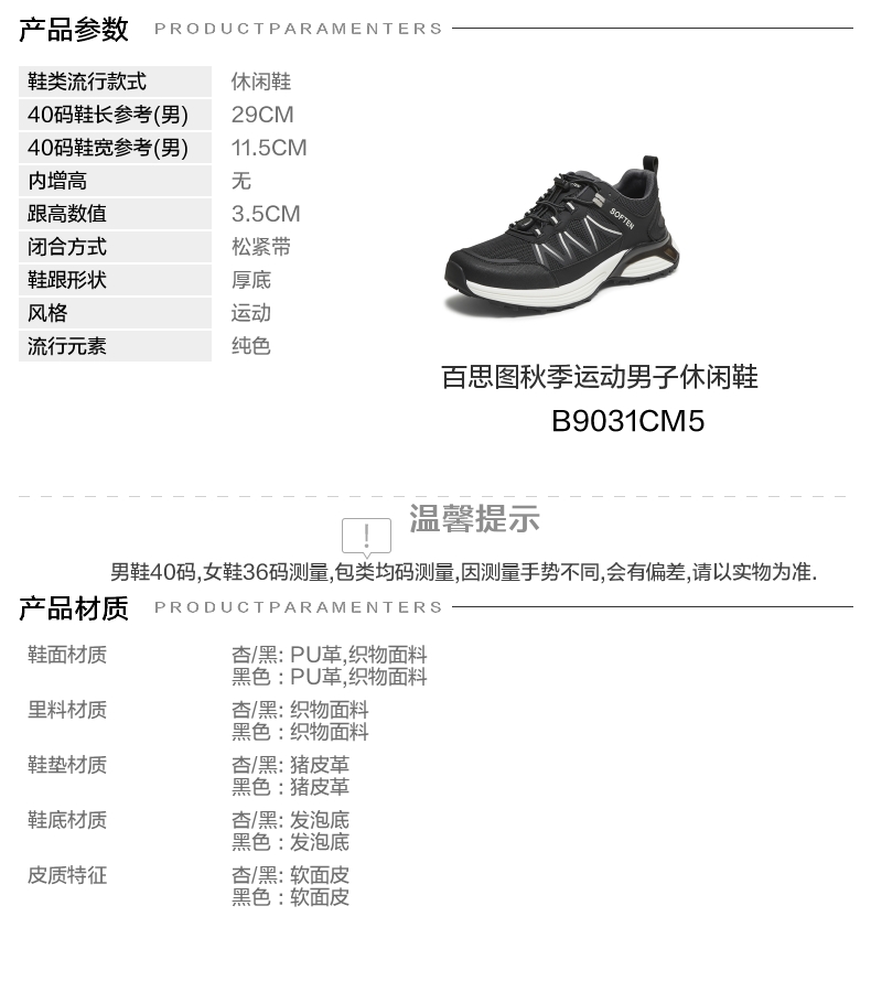 | 风格:运动 | 色系:黑色 | 跟高数值:3.5CM | 40码鞋宽参考(男):11.5CM | 性别:男子 |