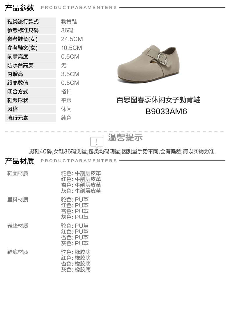 | 配跟:无 | 上市时间:2026年春季 | 鞋类流行款式:勃肯鞋 | 鞋头款式:圆头 | 鞋面图案:纯色 |