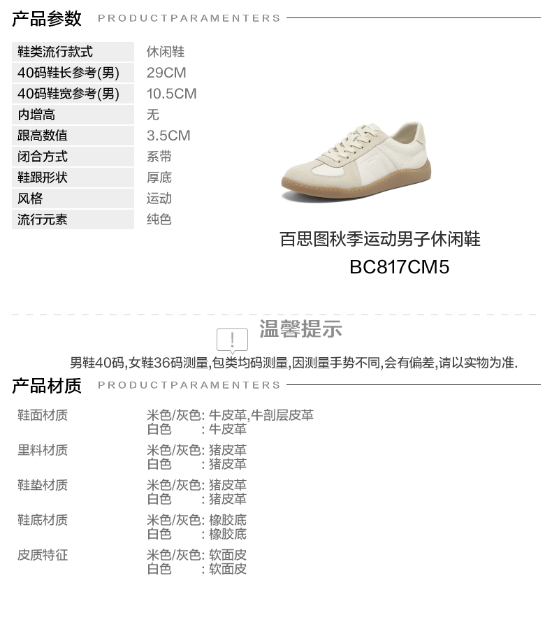 | 风格:运动 | 色系:米色 | 跟高数值:3.5CM | 40码鞋宽参考(男):10.5CM | 性别:男子 |