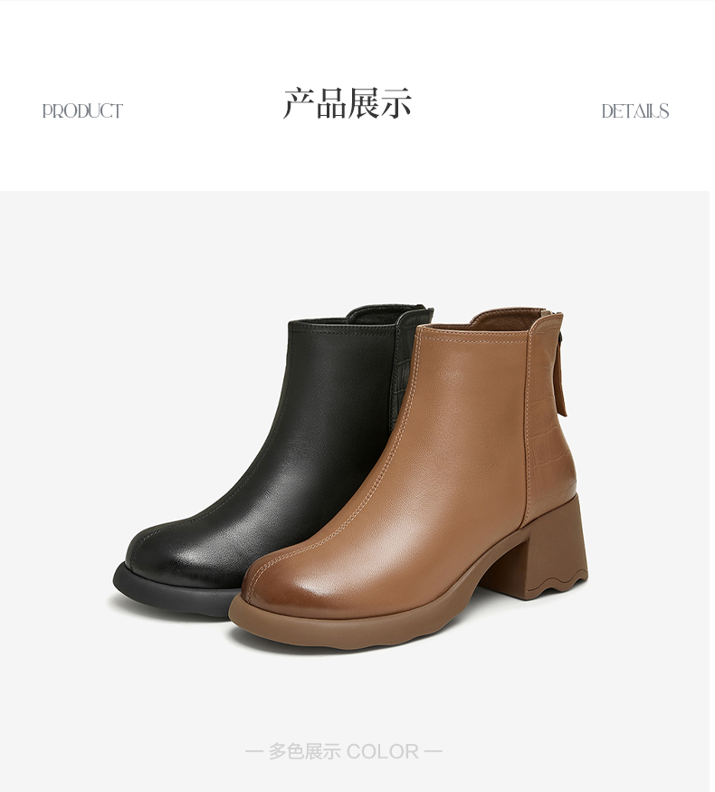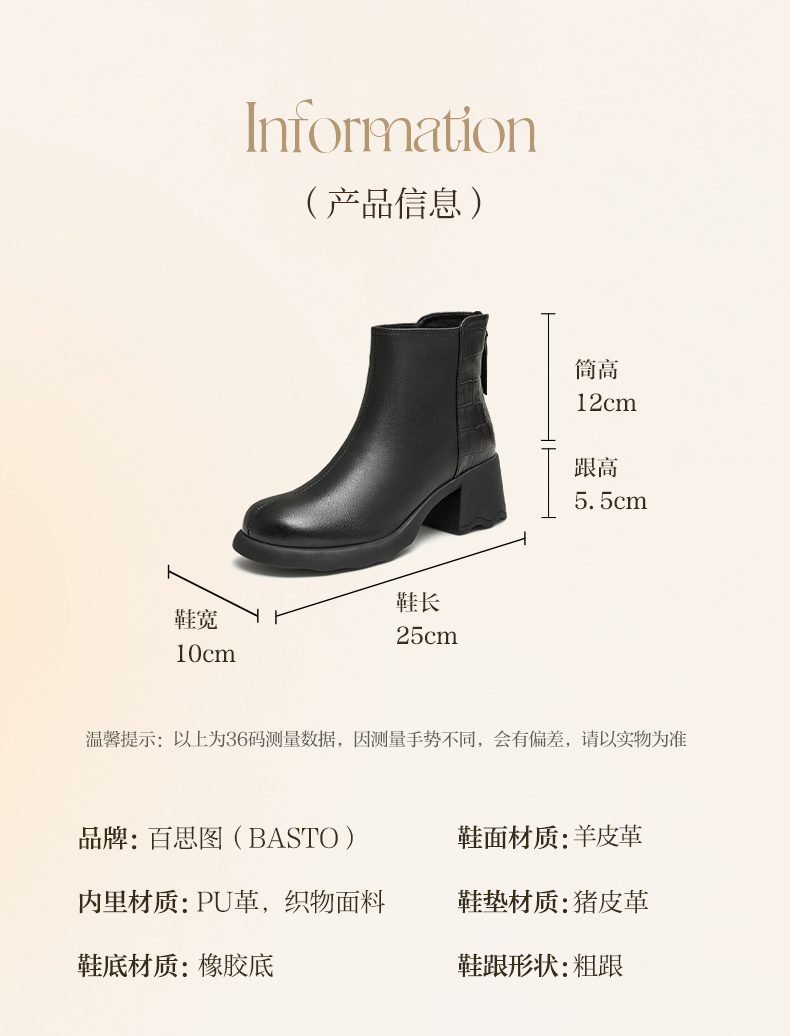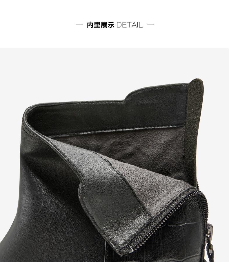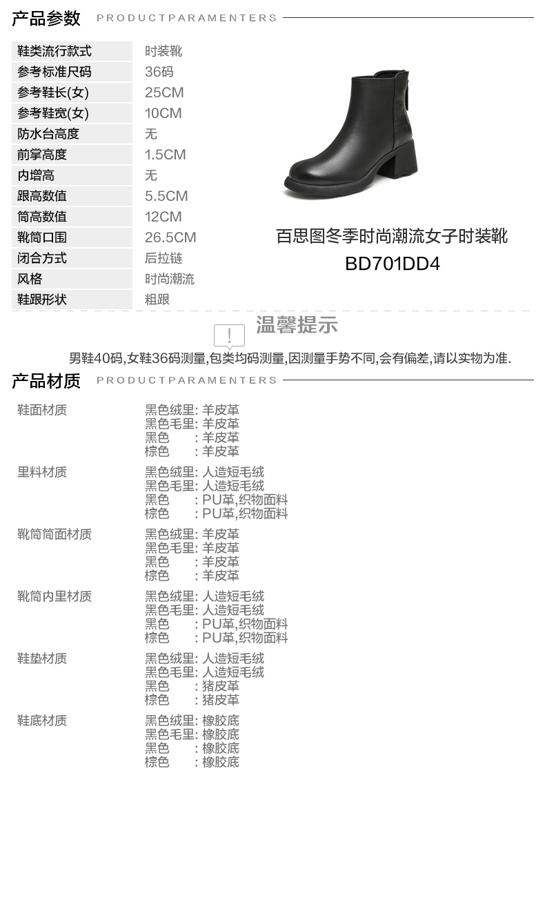 | 鞋底材质:橡胶底 | 靴筒内里材质:人造短毛绒 | 内增高:无 | 鞋面材质:羊皮革 | 闭合方式:后拉链 |