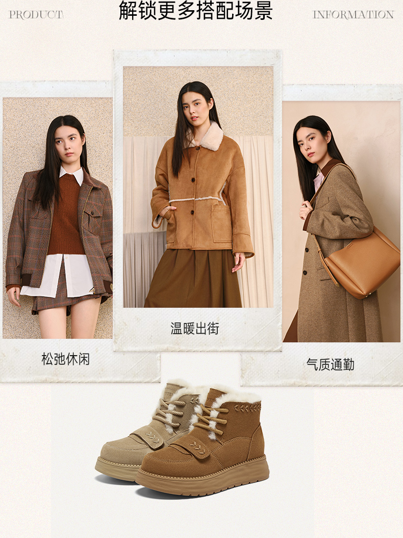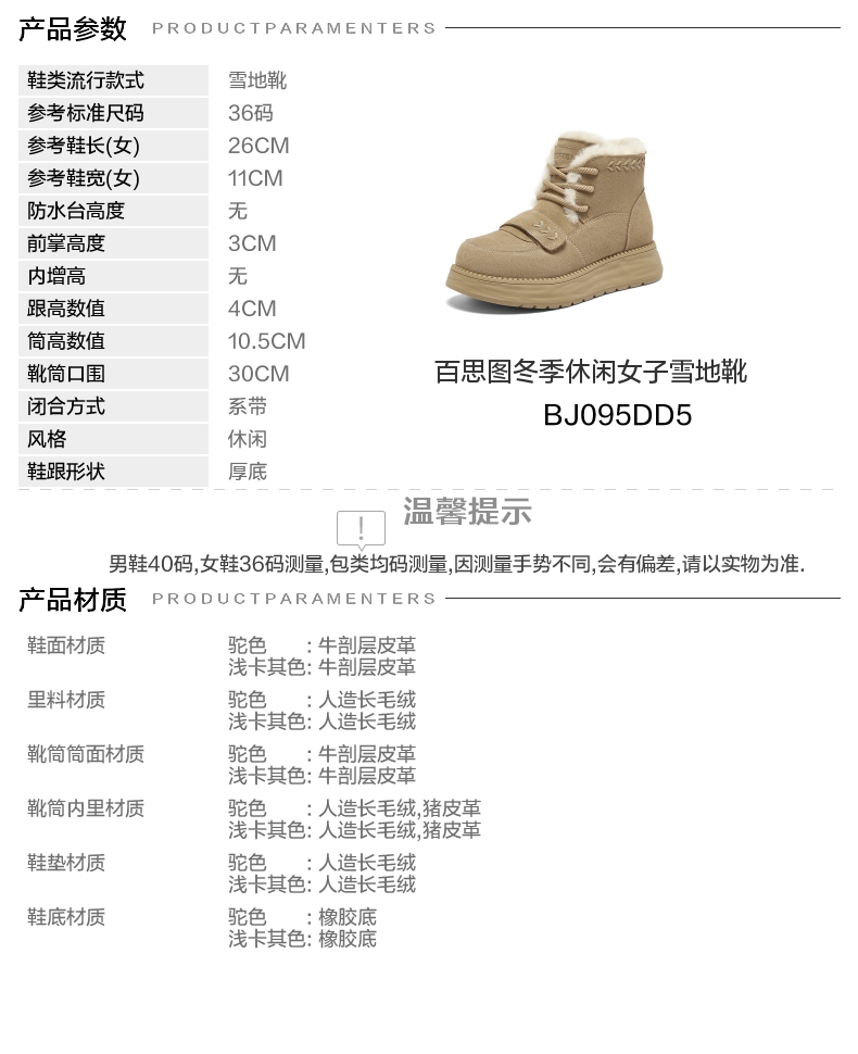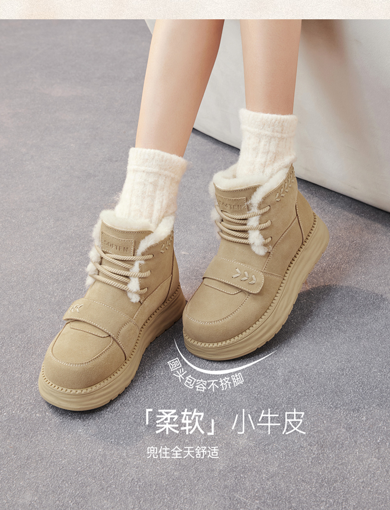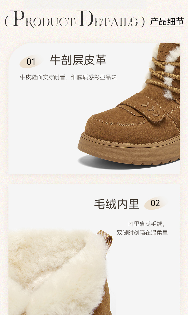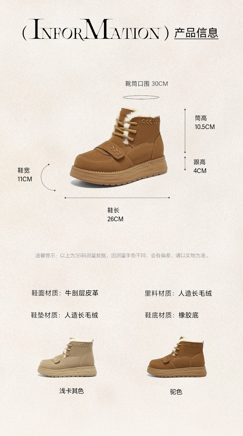 | 帮面材质:牛二层皮 | 配跟:无 | 靴筒口围:30CM | 上市时间:2025年冬季 | 鞋类流行款式:雪地靴 |