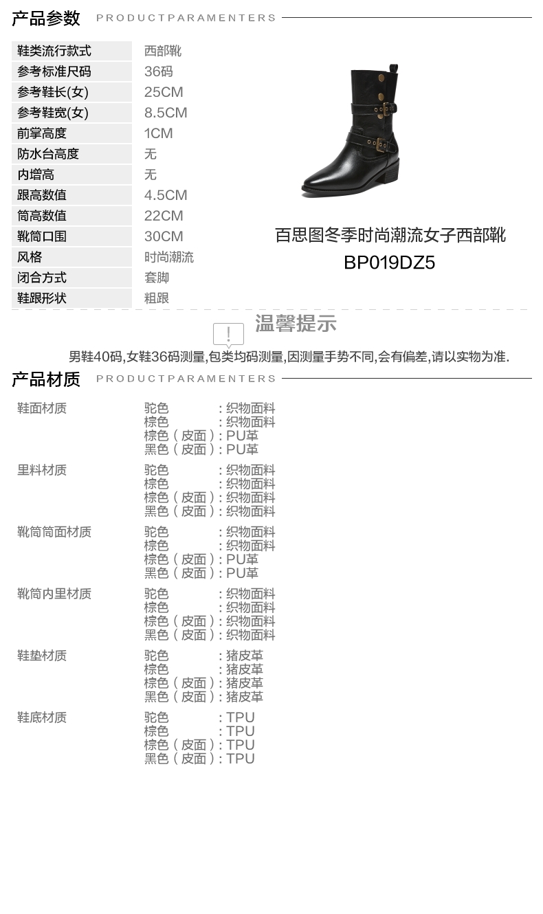 | 靴筒筒面材质:PU革 | 靴筒小腿围:30CM | 里料材质:织物面料 | 制鞋工艺:胶贴皮鞋 | 鞋垫材质:猪皮革 |