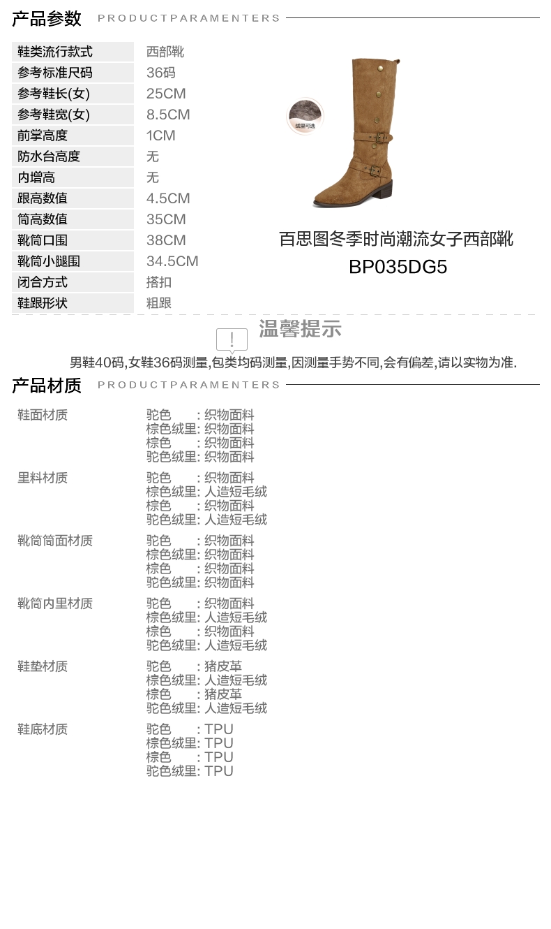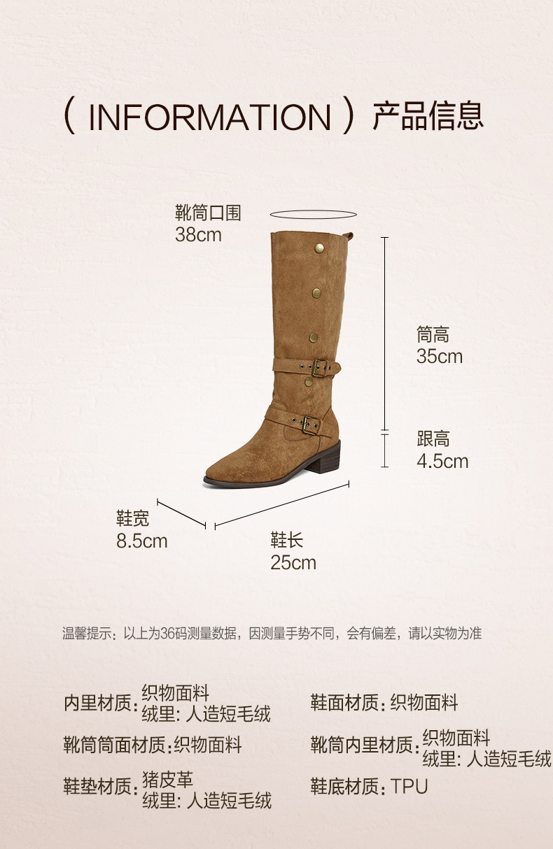 | 风格:时尚潮流 | 色系:棕色 | 跟高数值:4.5CM | 性别:女子 | 筒高数值:35CM |