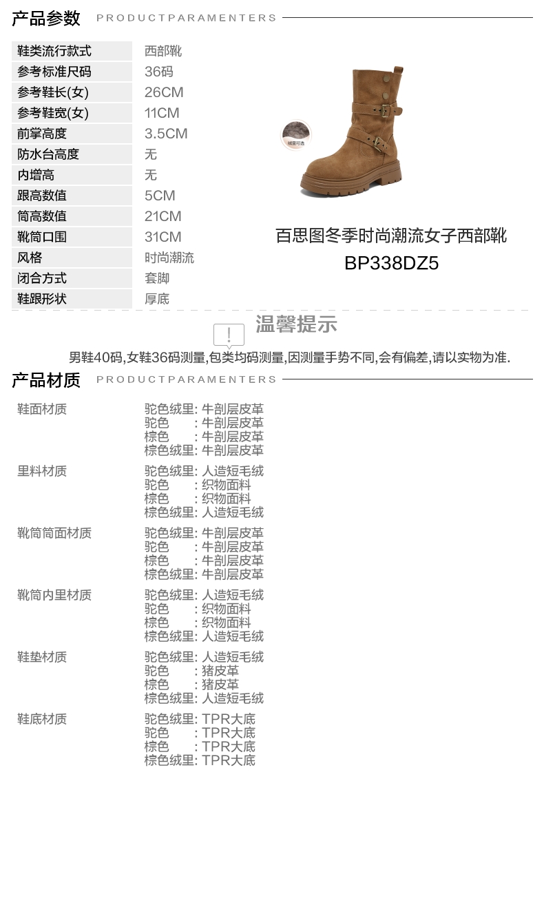 鞋底材质:TPR大底 靴筒内里材质:人造短毛绒 内增高:无 鞋面材质:牛剖层皮革 闭合方式:套脚