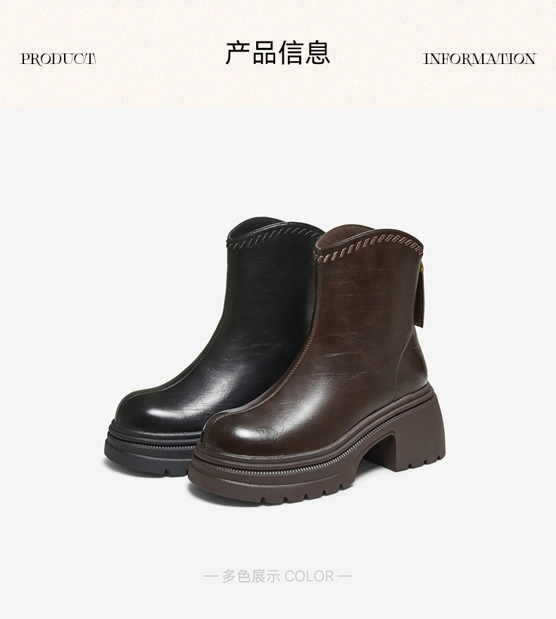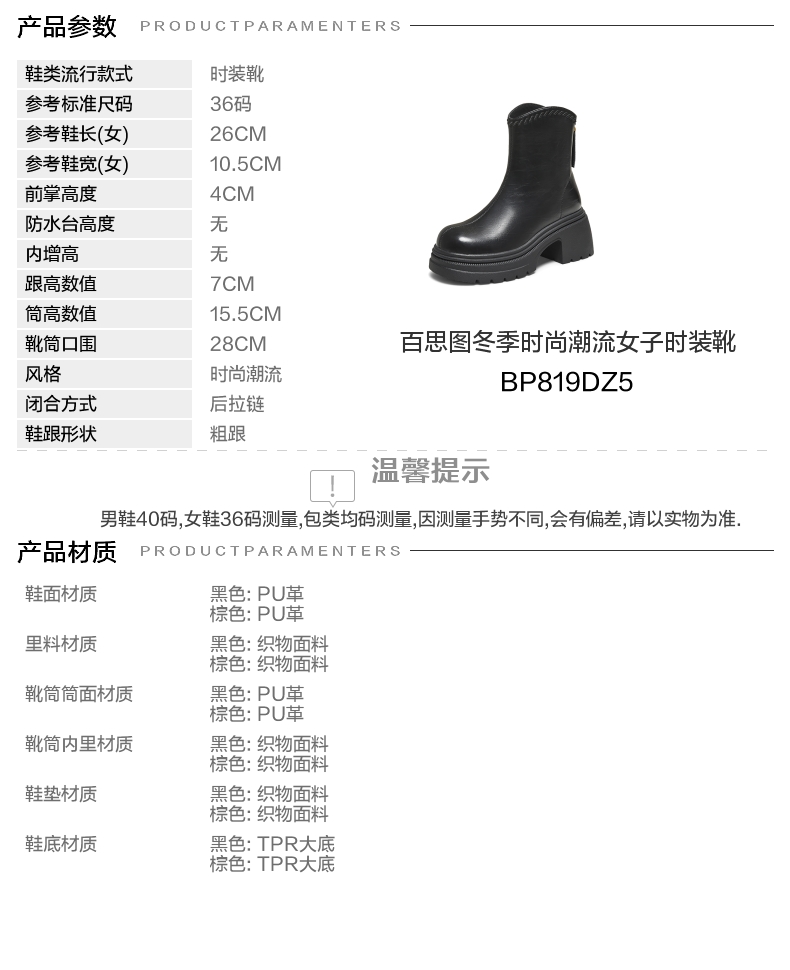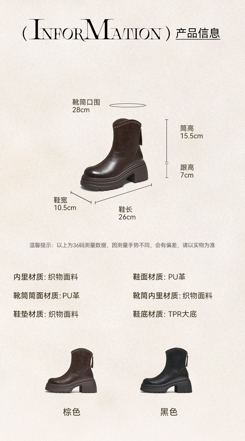 | 鞋底材质:TPR大底 | 靴筒内里材质:织物面料 | 内增高:无 | 鞋面材质:PU革 | 闭合方式:后拉链 |