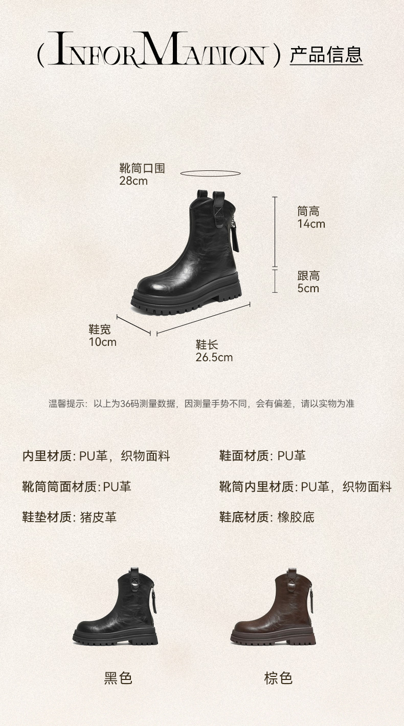 | 鞋底材质:橡胶底 | 靴筒内里材质:织物面料PU革 | 内增高:无 | 鞋面材质:PU革 | 闭合方式:后拉链 |