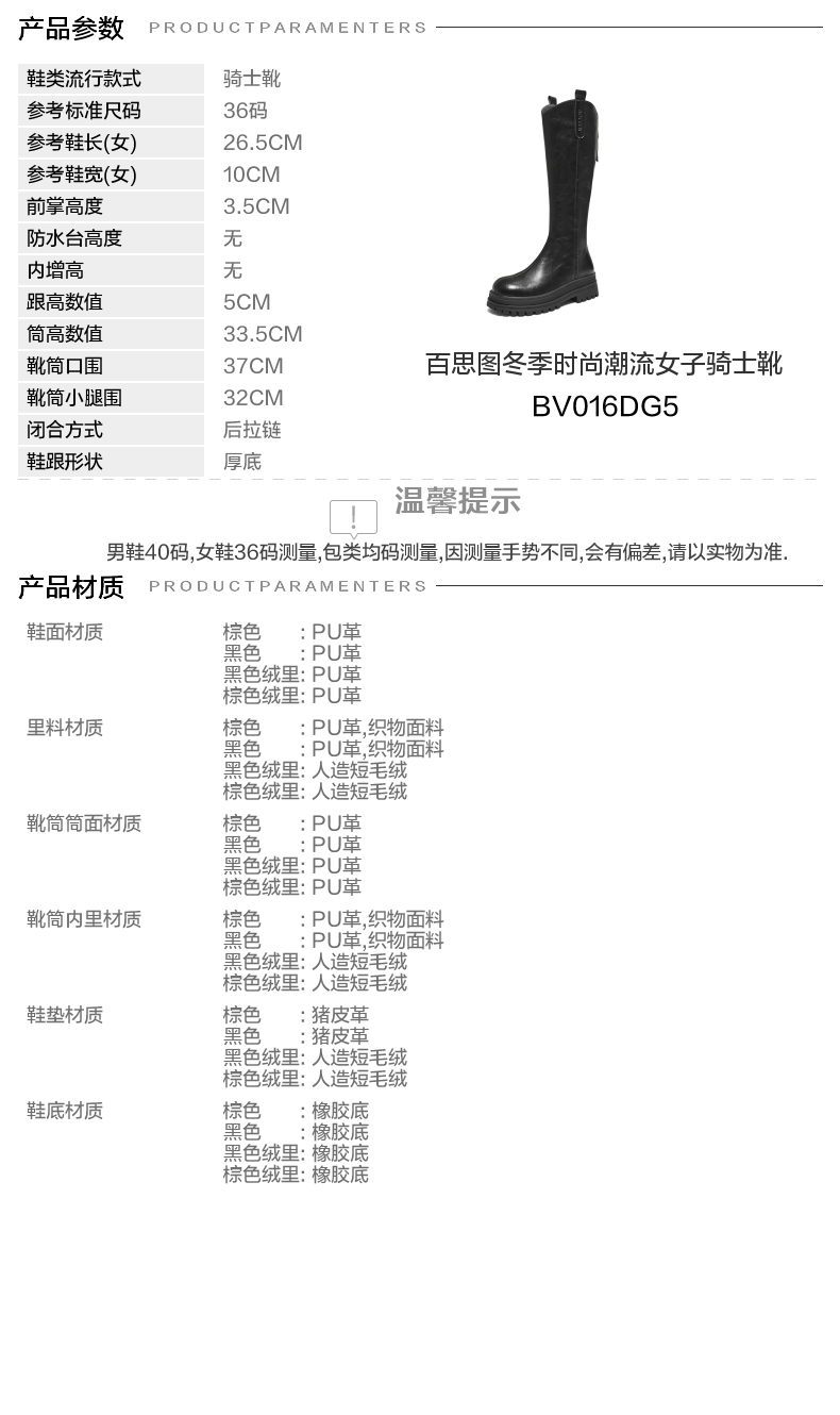 | 靴筒筒面材质:PU革 | 靴筒小腿围:32CM | 里料材质:人造短毛绒 | 制鞋工艺:胶贴皮鞋 | 鞋垫材质:人造短毛绒 |