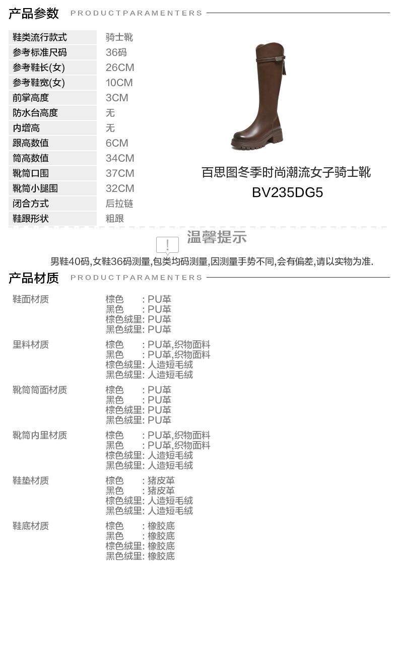 | 靴筒筒面材质:PU革 | 靴筒小腿围:32CM | 里料材质:人造短毛绒 | 制鞋工艺:胶贴皮鞋 | 鞋垫材质:人造短毛绒 |