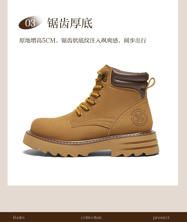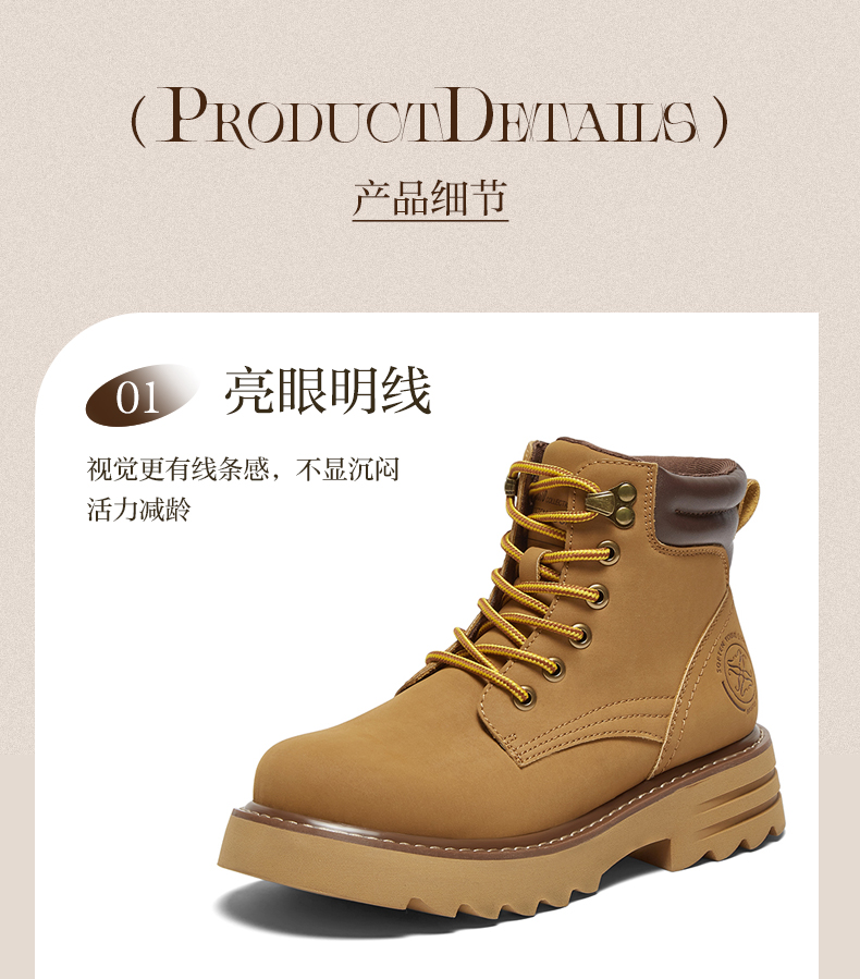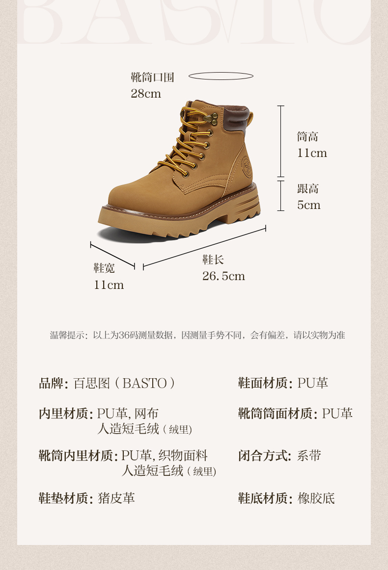 | 鞋底材质:橡胶底 | 靴筒内里材质:人造短毛绒 | 内增高:无 | 鞋面材质:PU革 | 闭合方式:系带 |