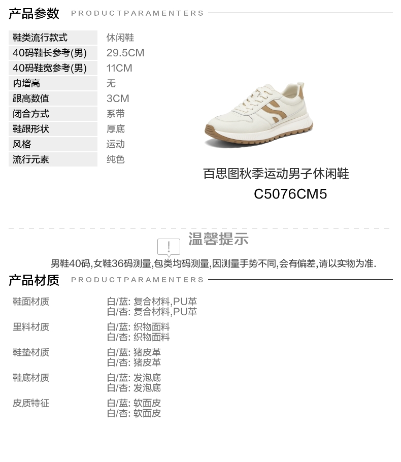 | 风格:运动 | 色系:白色 | 跟高数值:3CM | 40码鞋宽参考(男):11CM | 性别:男子 |