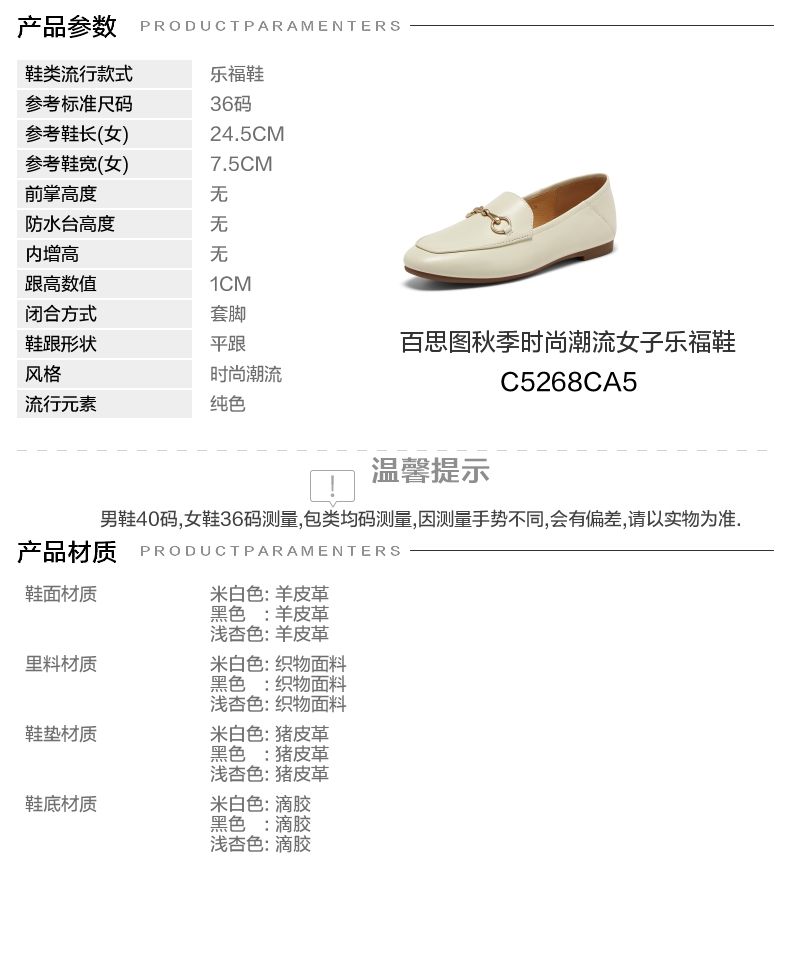 | 配跟:无 | 上市时间:2025年秋季 | 鞋类流行款式:乐福鞋 | 鞋头款式:圆头 | 鞋面图案:纯色 |