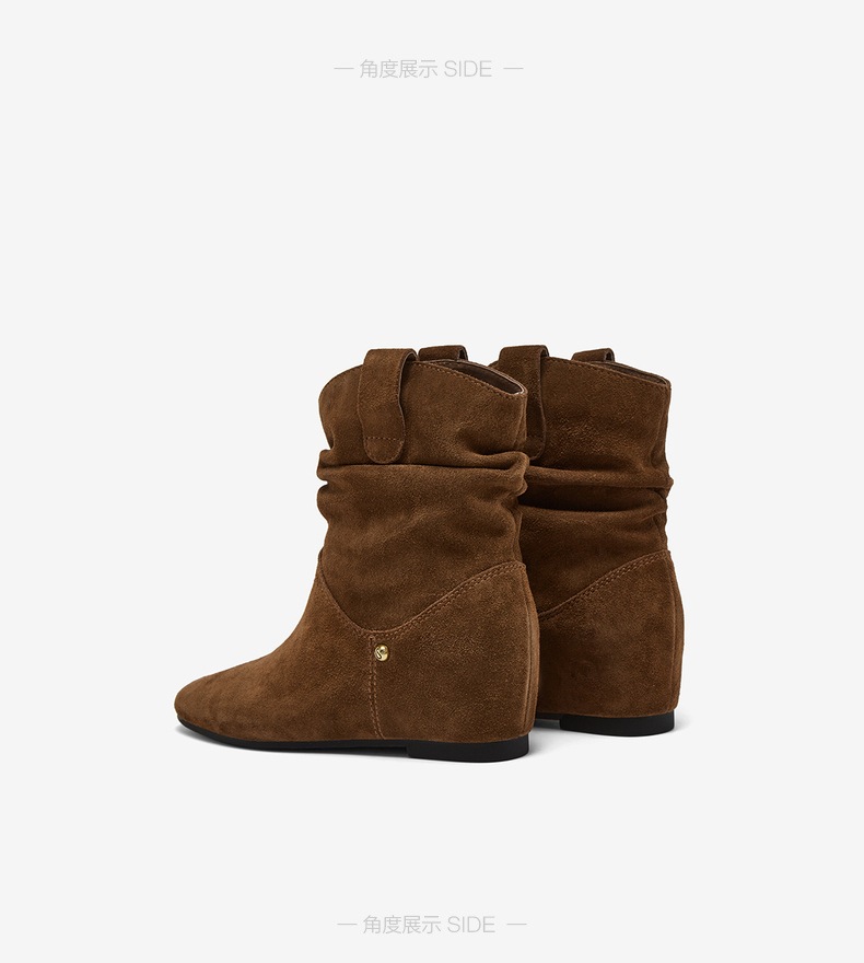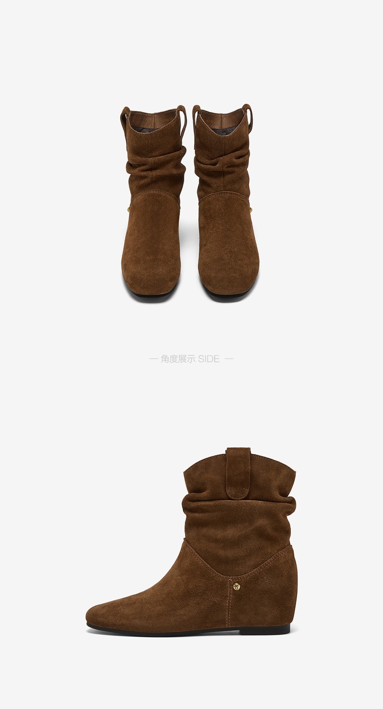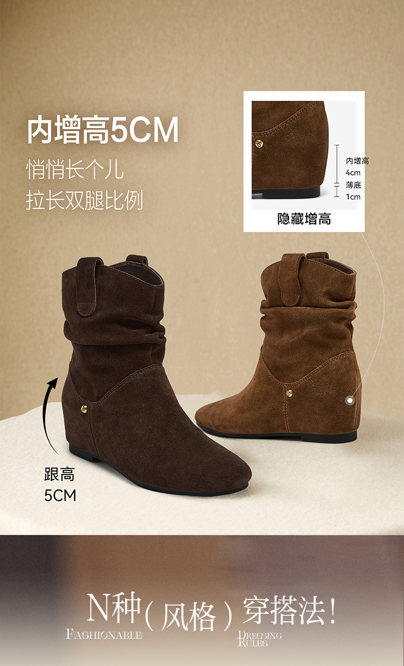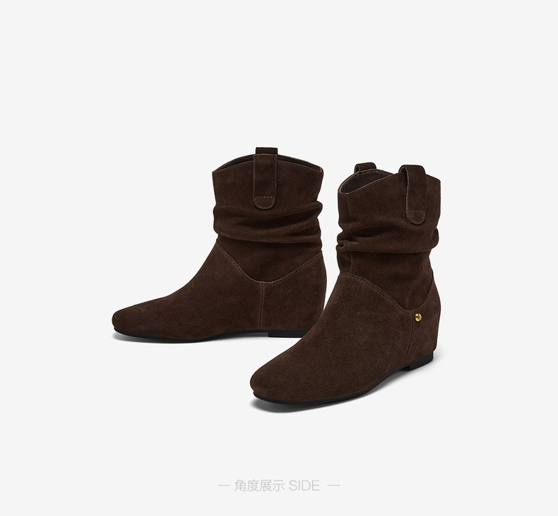 | 鞋底材质:滴胶 | 靴筒内里材质:猪皮革 | 内增高:4CM | 鞋面材质:牛剖层皮革 | 闭合方式:套脚 |