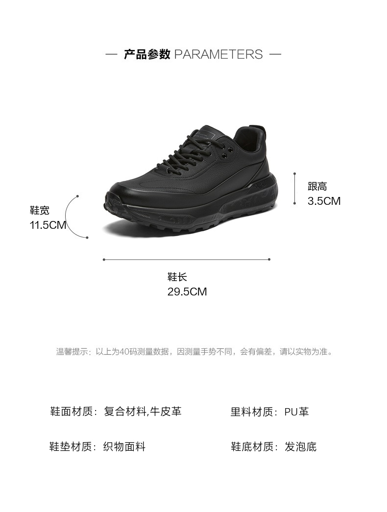 | 风格:运动 | 色系:黑色 | 跟高数值:3.5CM | 40码鞋宽参考(男):11.5CM | 性别:男子 |