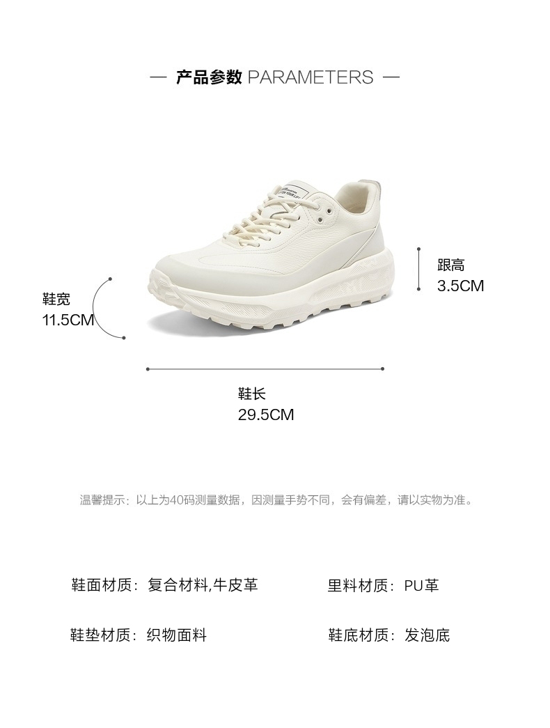 | 风格:运动 | 色系:白色 | 跟高数值:3.5CM | 40码鞋宽参考(男):11.5CM | 性别:男子 |