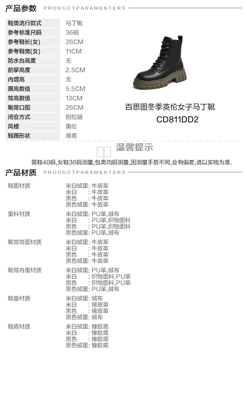 | 参考鞋宽(女):11CM | 风格:英伦 | 色系:黑色 | 跟高数值:5.5CM | 筒高数值:13CM |