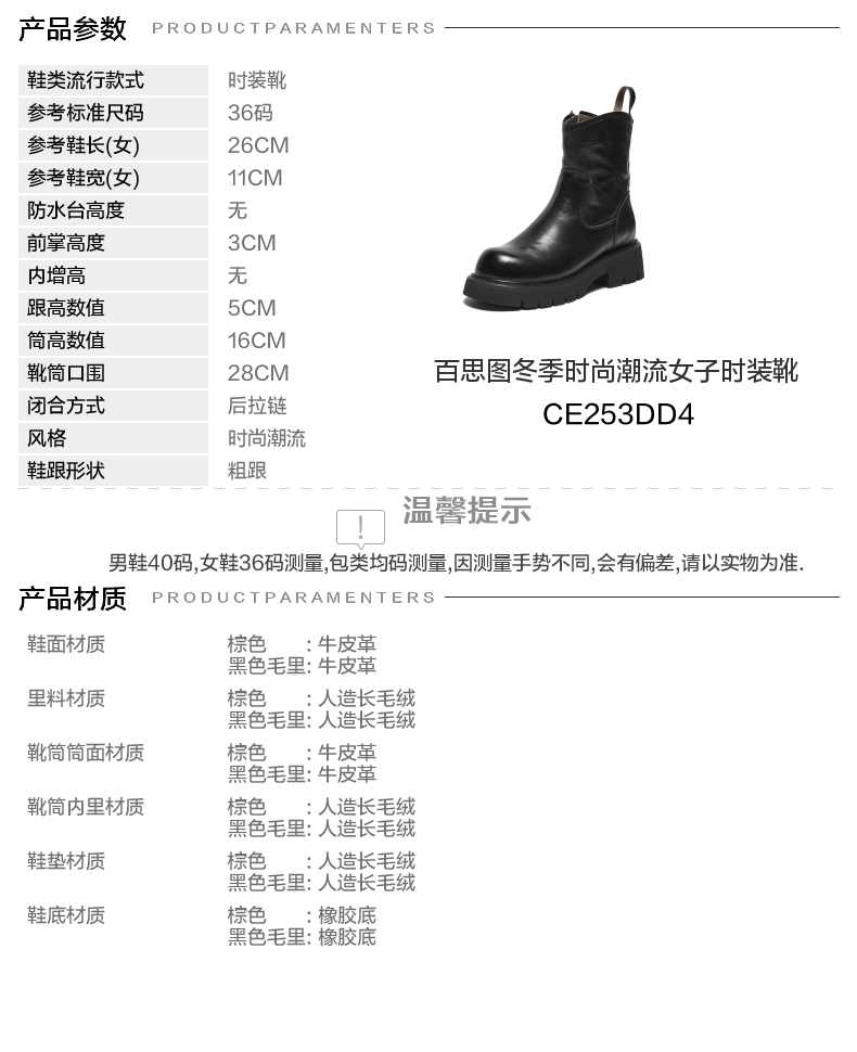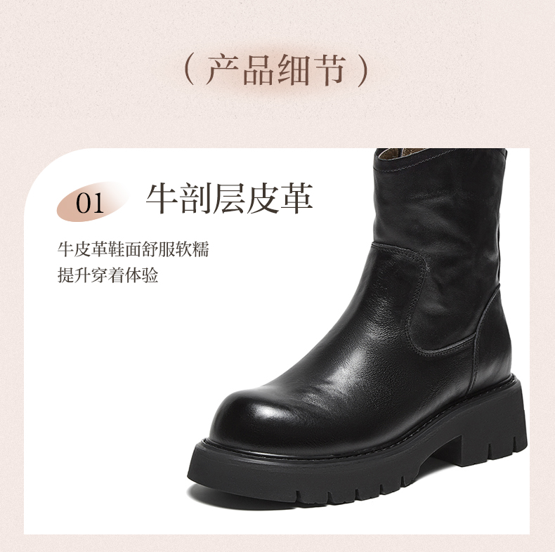 | 鞋底材质:橡胶底 | 靴筒内里材质:人造长毛绒 | 内增高:无 | 鞋面材质:牛皮革 | 适用场合:办公室约会日常休闲 |