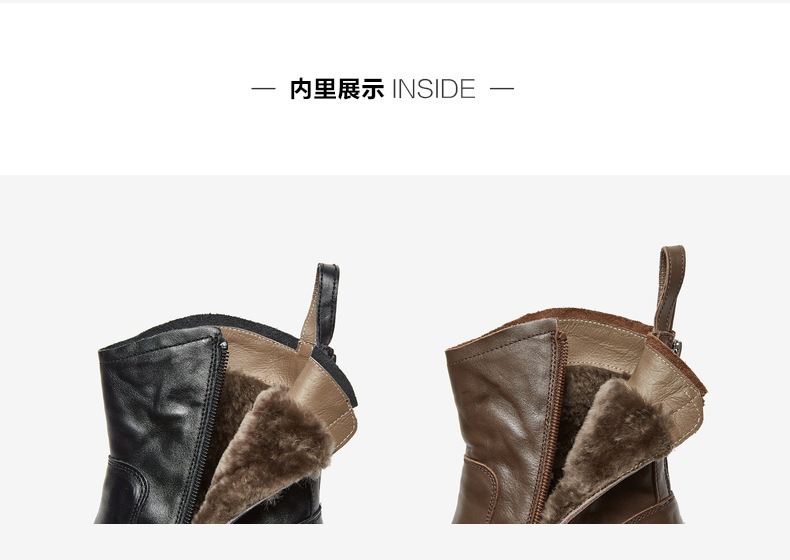 | 性别:女子 | 靴筒筒面材质:牛皮革 | 里料材质:人造长毛绒 | 制鞋工艺:胶贴皮鞋 | 款式季节:冬季 |