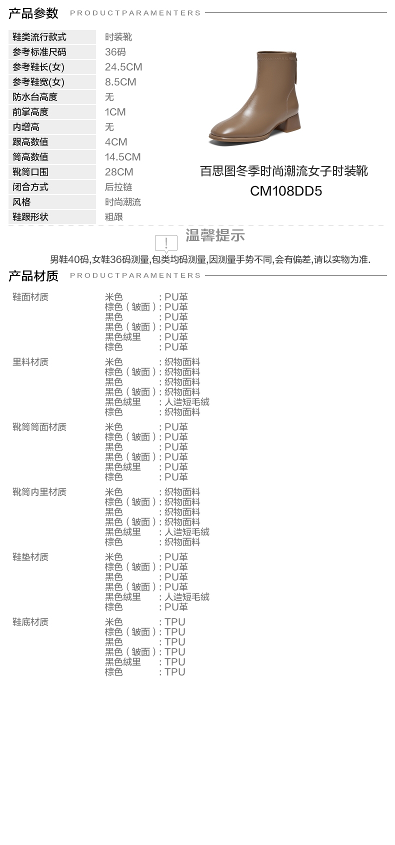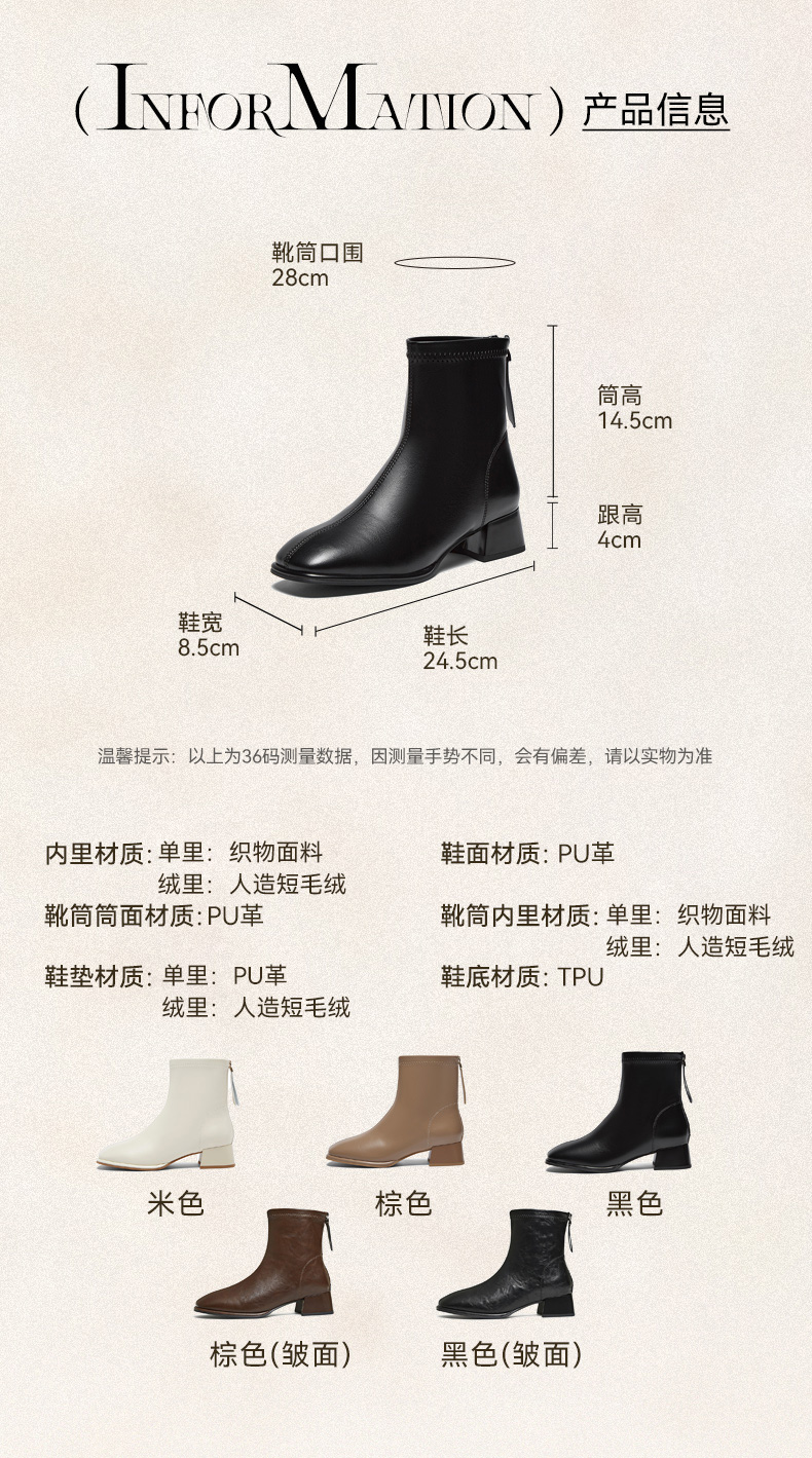 | 鞋底材质:TPU | 靴筒内里材质:织物面料 | 内增高:无 | 鞋面材质:PU革 | 闭合方式:后拉链 |