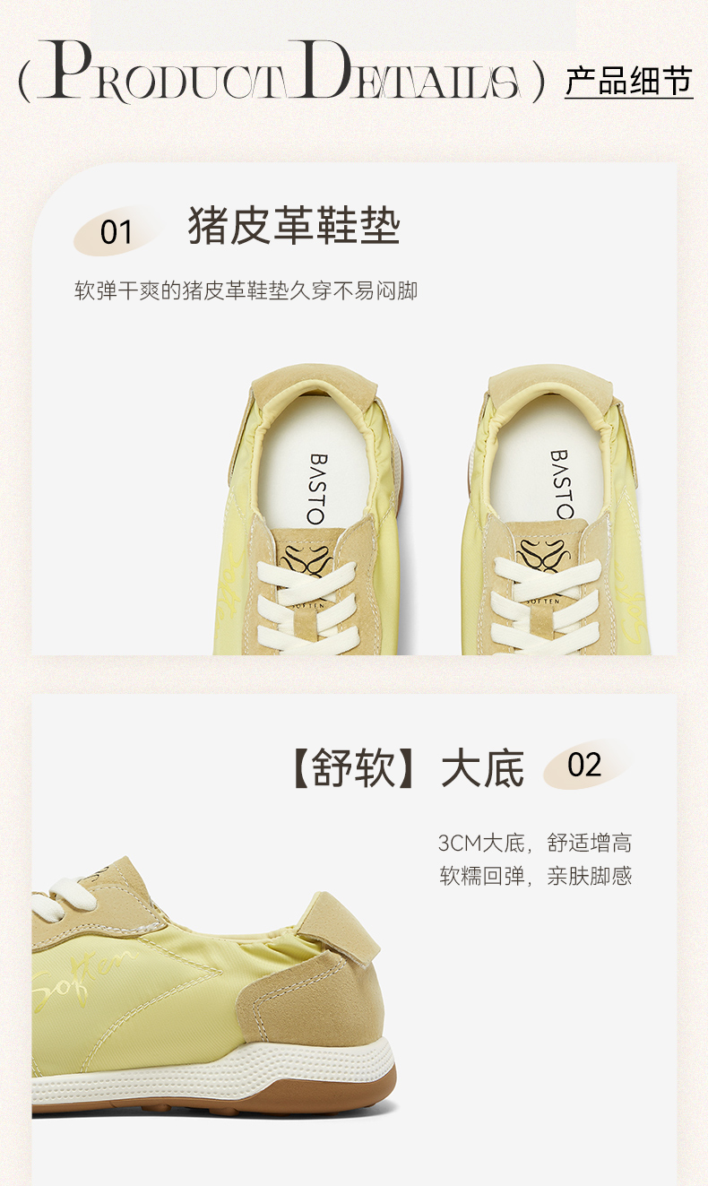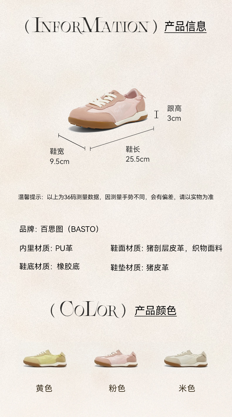 BASTO(百思图),品牌拥有17年历史,秉承优雅、甜美、清新的设计理念,主张“好嫁风”的产品风格,将甜美俏丽的少女情怀融合优雅气质的时尚品味,塑造出唯美优雅、受欢迎的女鞋款式。主打以女性温柔与亲和力为特色的流行时尚产品,糅合雅致又富有亲和力的裸粉色调,淑媛端庄、清新甜美。目前品牌已开设线下门店达1400多家。