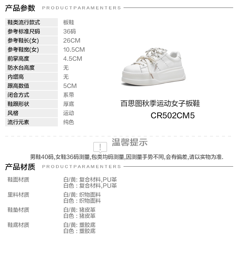 | 鞋跟形状:厚底 | 参考鞋长(女):26CM | 流行元素:纯色 | 参考鞋宽(女):10.5CM | 风格:运动 |