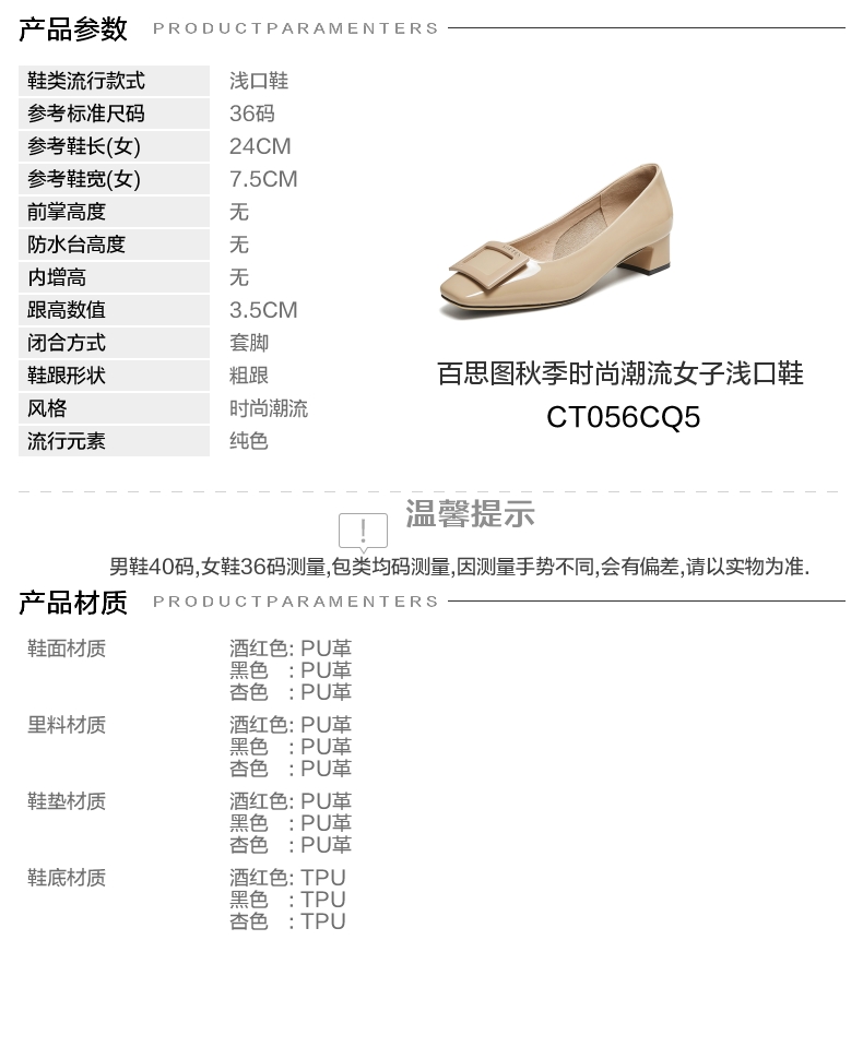 | 鞋头款式:方头 | 鞋底材质:TPU | 鞋面图案:纯色 | 内增高:无 | 鞋跟形状:粗跟 |