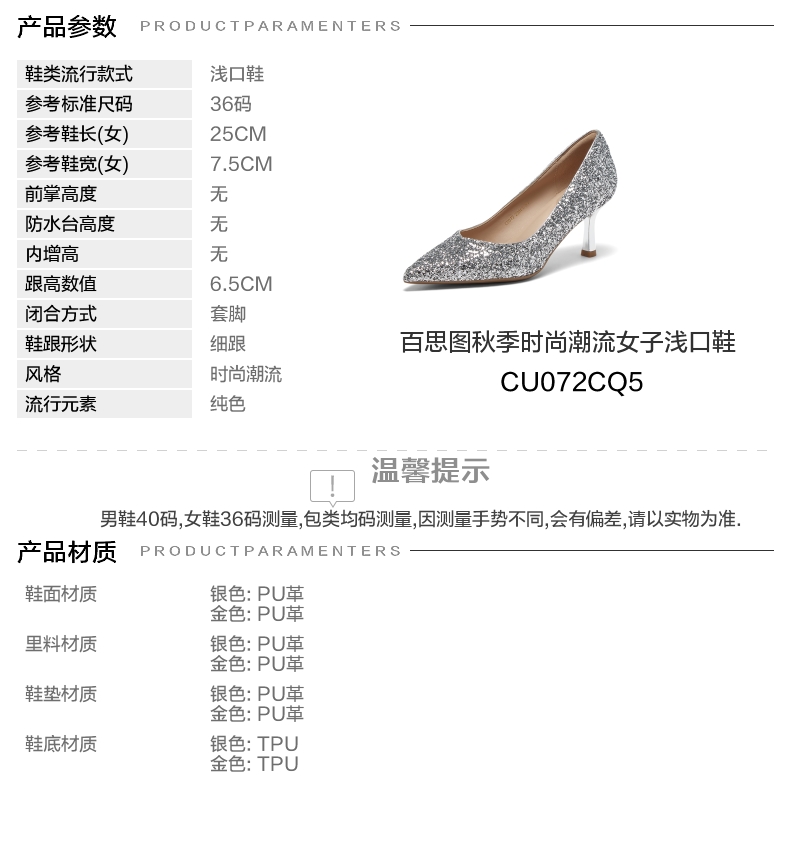 | 鞋头款式:尖头 | 鞋底材质:TPU | 鞋面图案:纯色 | 内增高:无 | 鞋跟形状:细跟 |