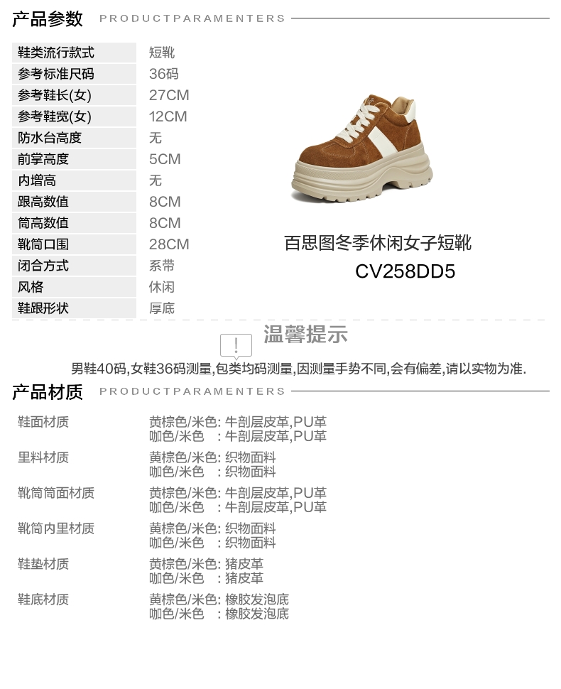 | 参考鞋宽(女):12CM | 风格:休闲 | 鞋面内里材质:织物 | 色系:棕色 | 跟高数值:8CM |