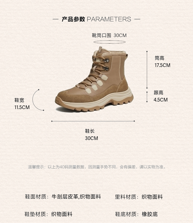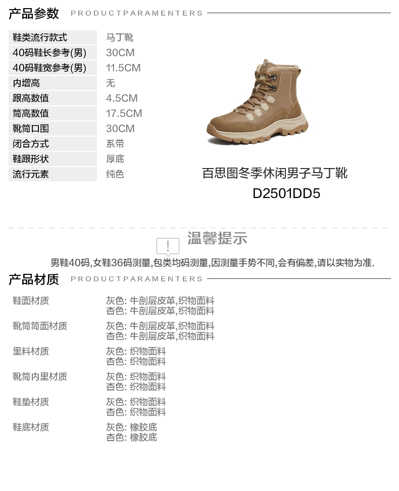 | 闭合方式:系带 | 40码鞋宽参考(男):11.5CM | 靴筒口围:30CM | 上市时间:2025年冬季 | 鞋类流行款式:马丁靴 |