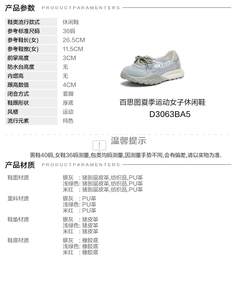 | 执行标准:舒适运动鞋Q/LR002-2023 | 跟高范围:中跟鞋(3-5CM) | 鞋面图案:纯色 | 鞋跟形状:厚底 | 厂家地址:广东省深圳市 |