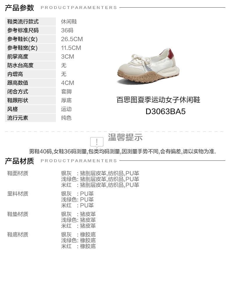 | 执行标准:舒适运动鞋Q/LR002-2023 | 跟高范围:中跟鞋(3-5CM) | 鞋面图案:纯色 | 鞋跟形状:厚底 | 厂家地址:广东省深圳市 |