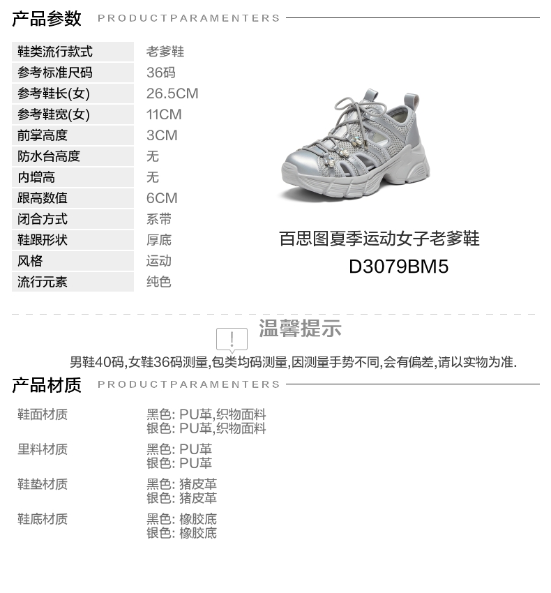 | 鞋垫材质:猪皮革 | 款式季节:夏季 | 前掌高度:3CM | 皮质特征:无 | 防水台高度:无 |