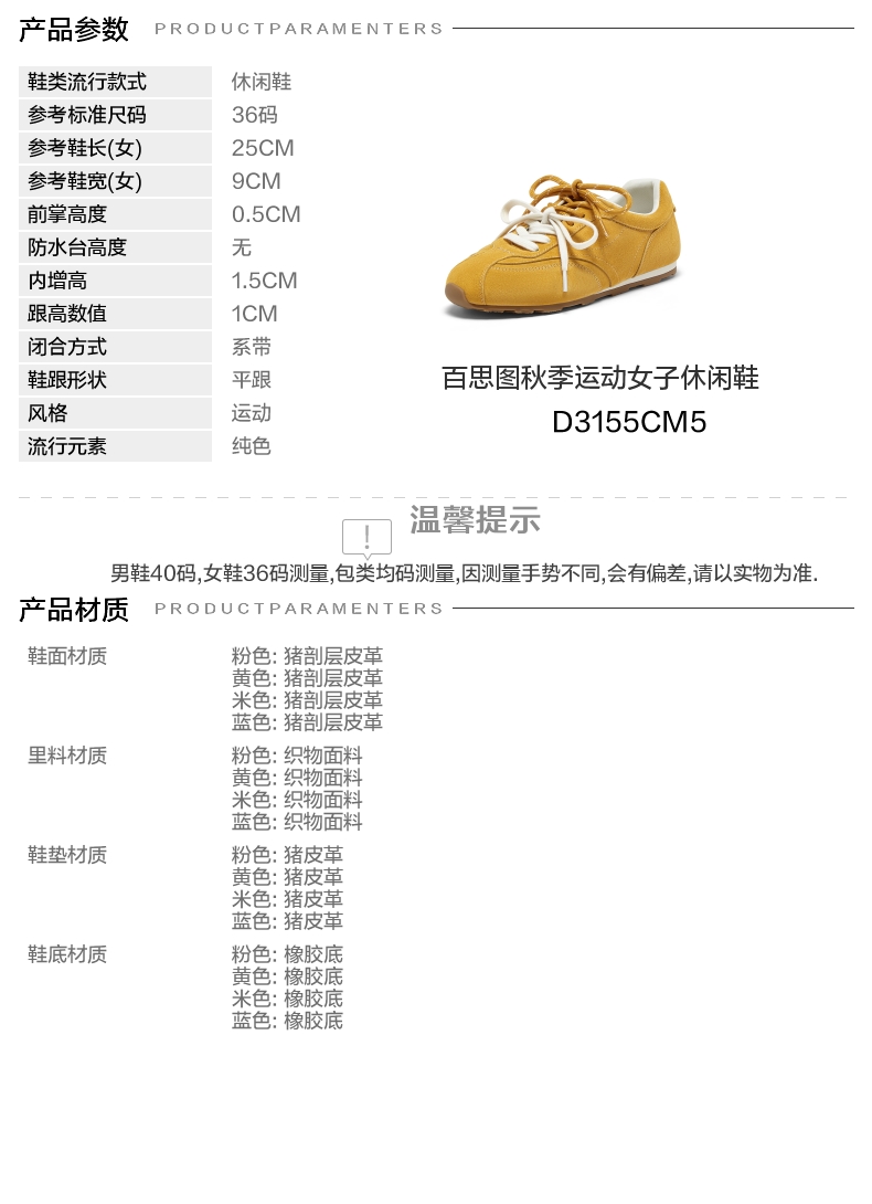 | 鞋帮:低帮 | 鞋底材质:橡胶底 | 内增高:1.5CM | 鞋面材质:猪剖层皮革 | 闭合方式:系带 |