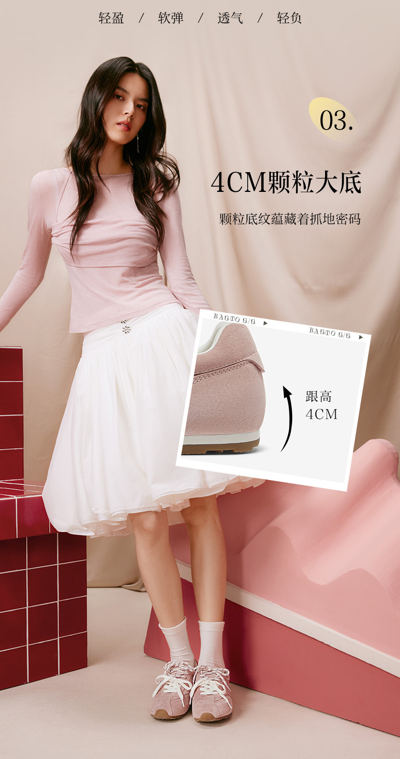 BASTO(百思图),品牌拥有17年历史,秉承优雅、甜美、清新的设计理念,主张“好嫁风”的产品风格,将甜美俏丽的少女情怀融合优雅气质的时尚品味,塑造出唯美优雅、受欢迎的女鞋款式。主打以女性温柔与亲和力为特色的流行时尚产品,糅合雅致又富有亲和力的裸粉色调,淑媛端庄、清新甜美。目前品牌已开设线下门店达1400多家。