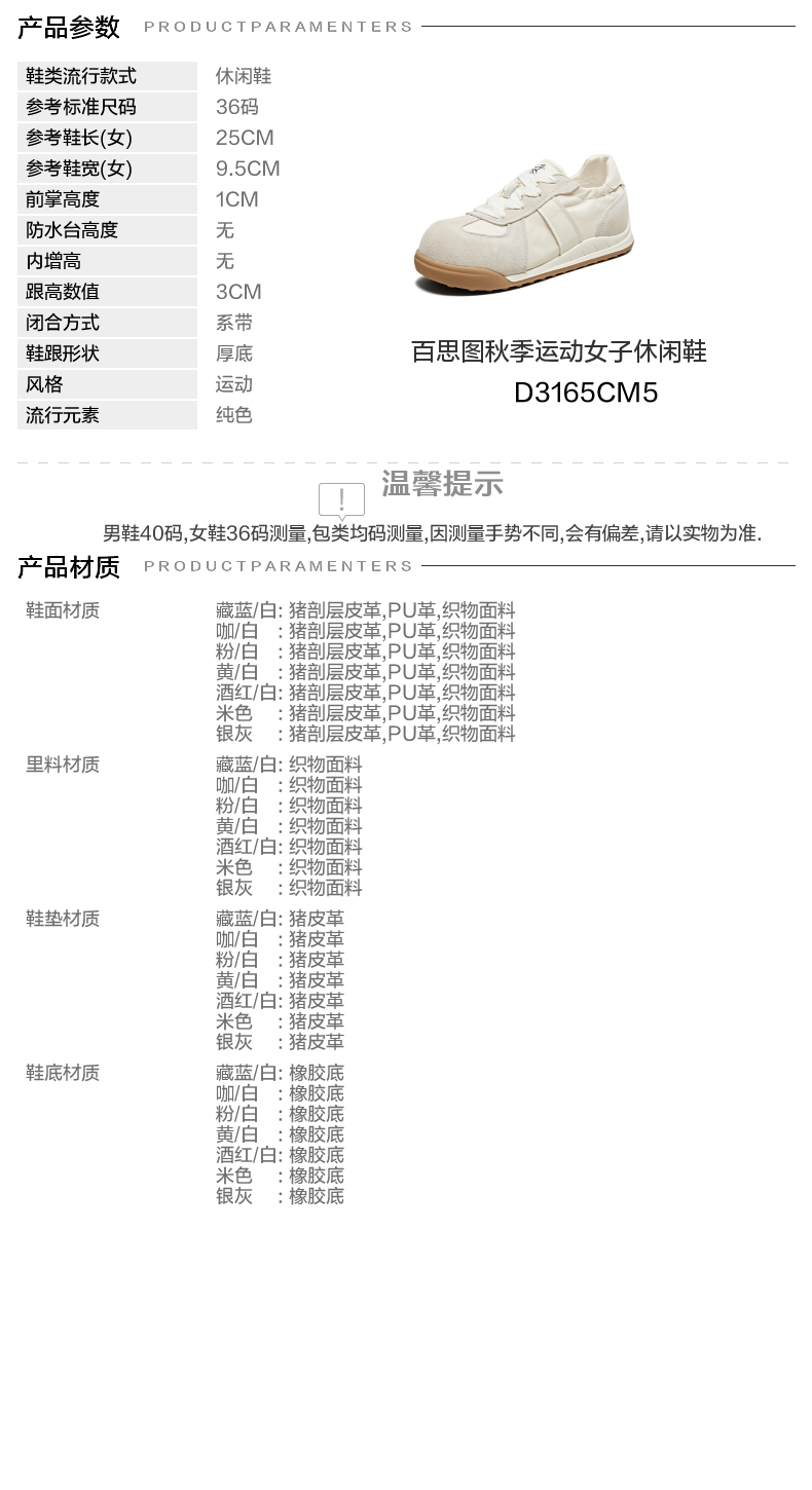 | 鞋跟形状:厚底 | 参考鞋长(女):25CM | 流行元素:纯色 | 参考鞋宽(女):9.5CM | 风格:运动 |