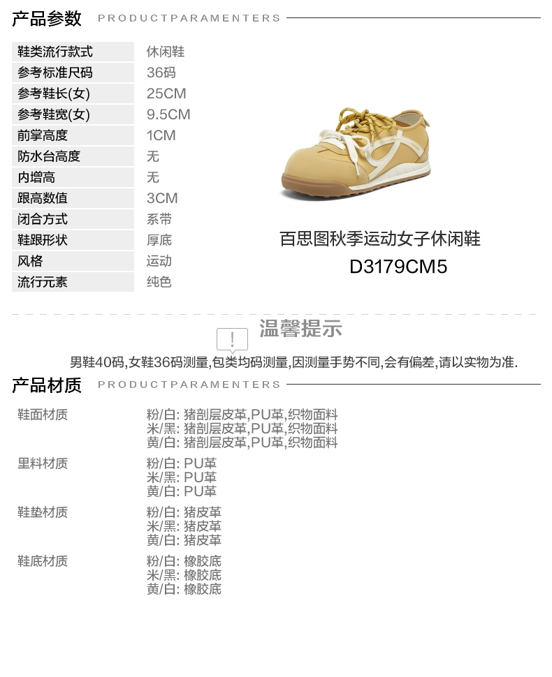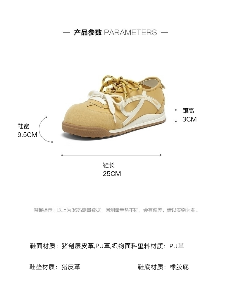 | 鞋帮:低帮 | 鞋底材质:橡胶底 | 内增高:无 | 鞋面材质:织物面料PU革猪剖层皮革 | 闭合方式:系带 |