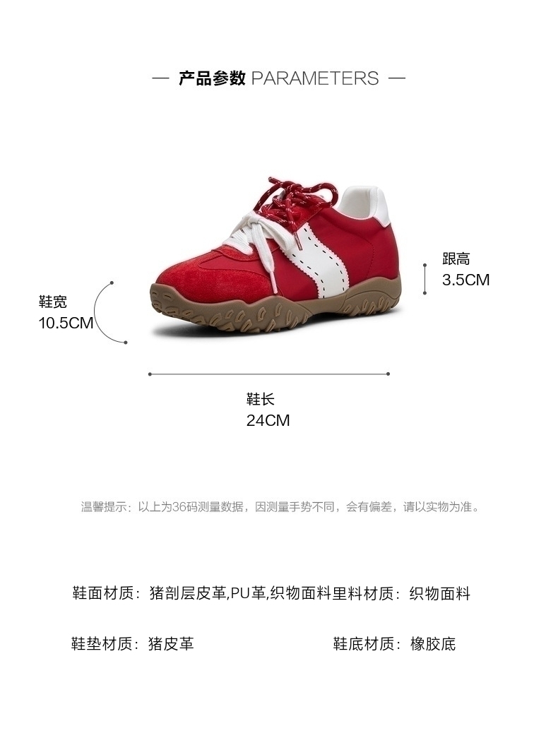 | 鞋帮:低帮 | 鞋底材质:橡胶底 | 内增高:4CM | 鞋面材质:织物面料PU革猪剖层皮革 | 闭合方式:系带 |