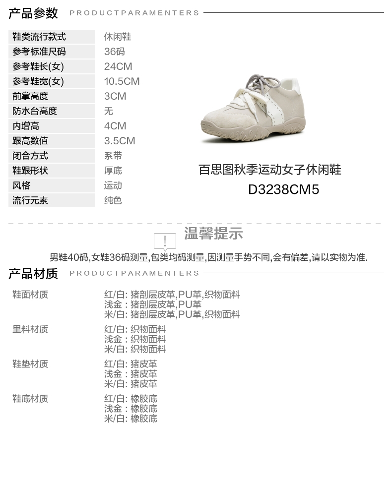| 鞋跟形状:厚底 | 参考鞋长(女):24CM | 流行元素:纯色 | 参考鞋宽(女):10.5CM | 风格:运动 |