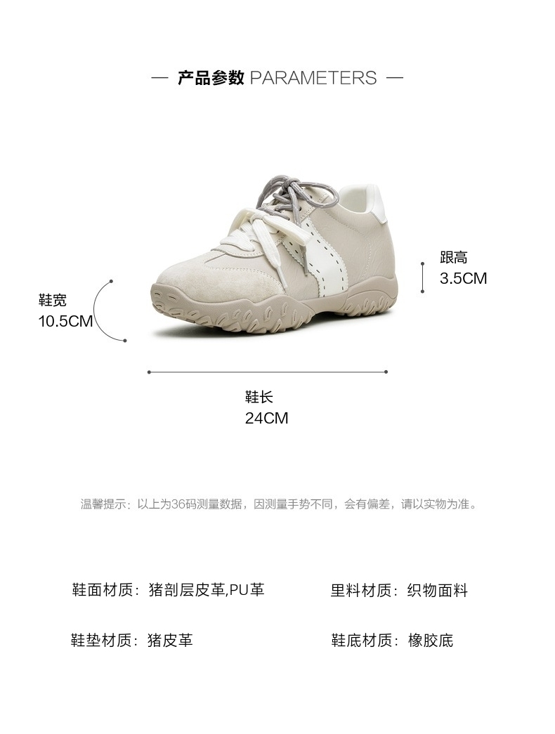 | 鞋帮:低帮 | 鞋底材质:橡胶底 | 内增高:4CM | 鞋面材质:PU革猪剖层皮革 | 闭合方式:系带 |
