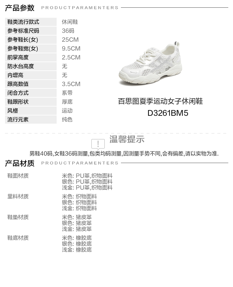 | 鞋跟形状:厚底 | 参考鞋长(女):25CM | 流行元素:纯色 | 参考鞋宽(女):9.5CM | 风格:运动 |