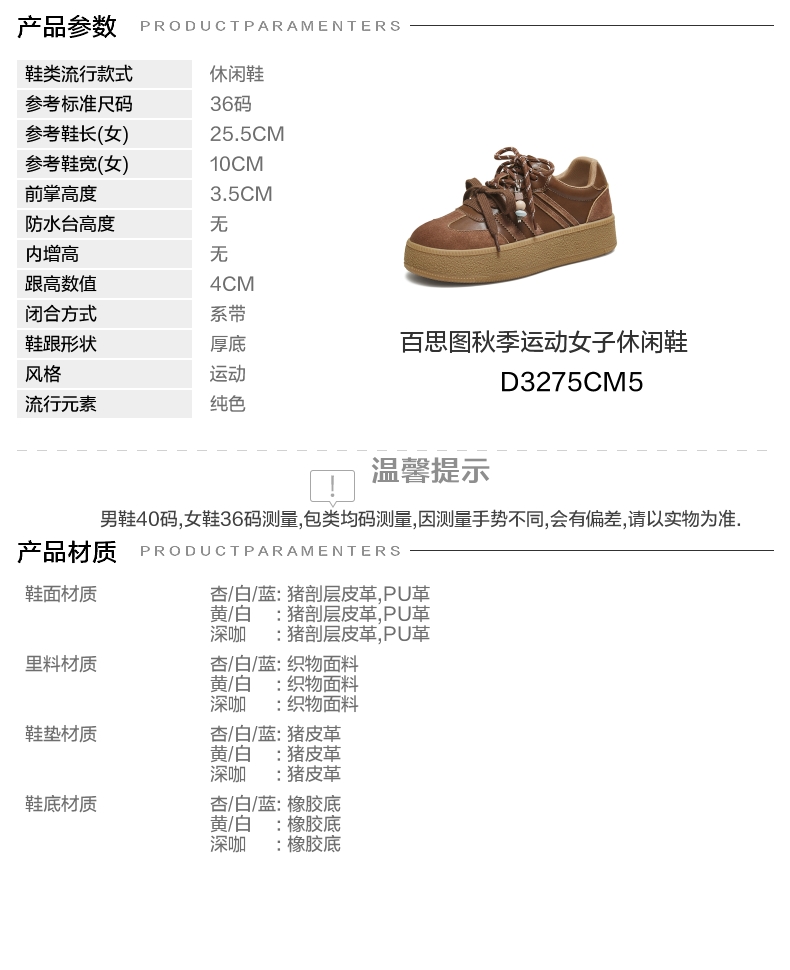 | 鞋跟形状:厚底 | 参考鞋长(女):25.5CM | 流行元素:纯色 | 参考鞋宽(女):10CM | 风格:运动 |