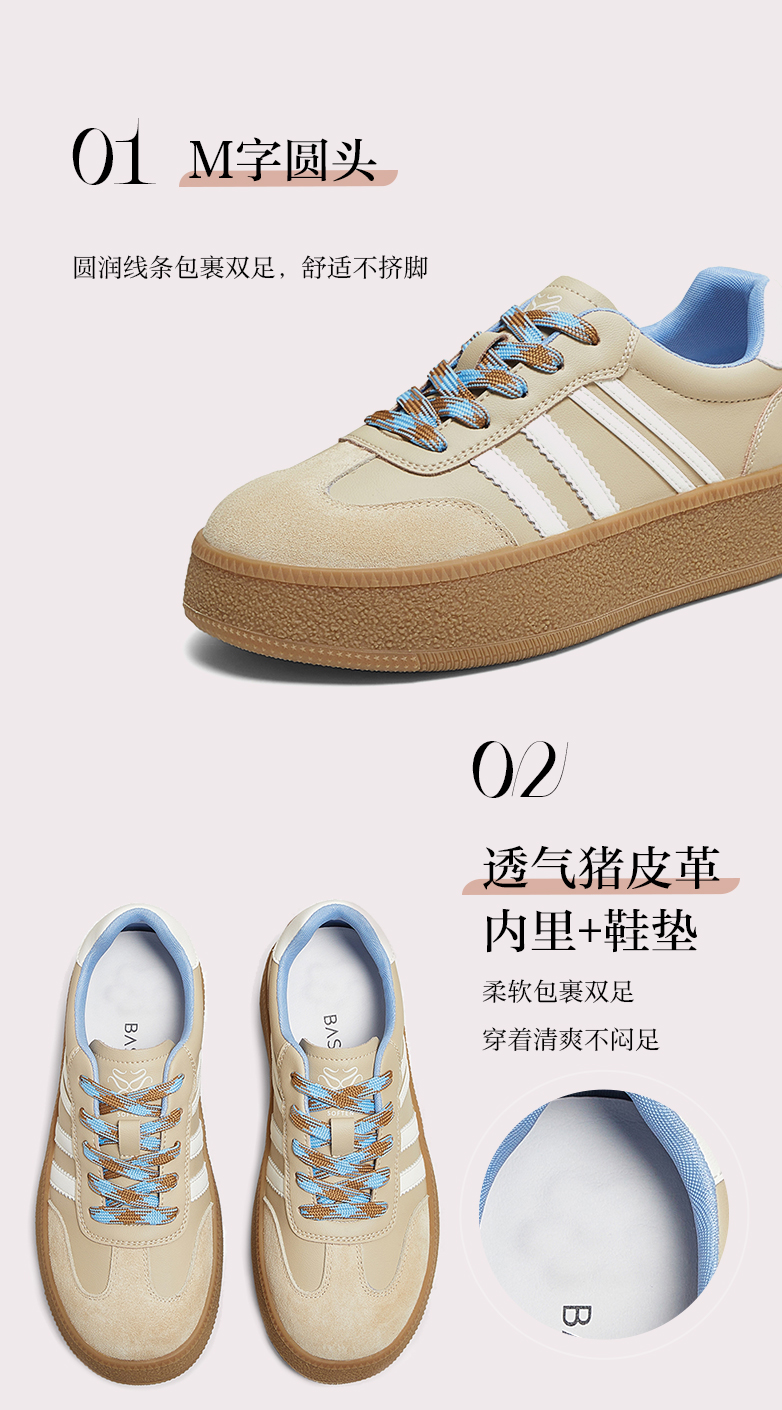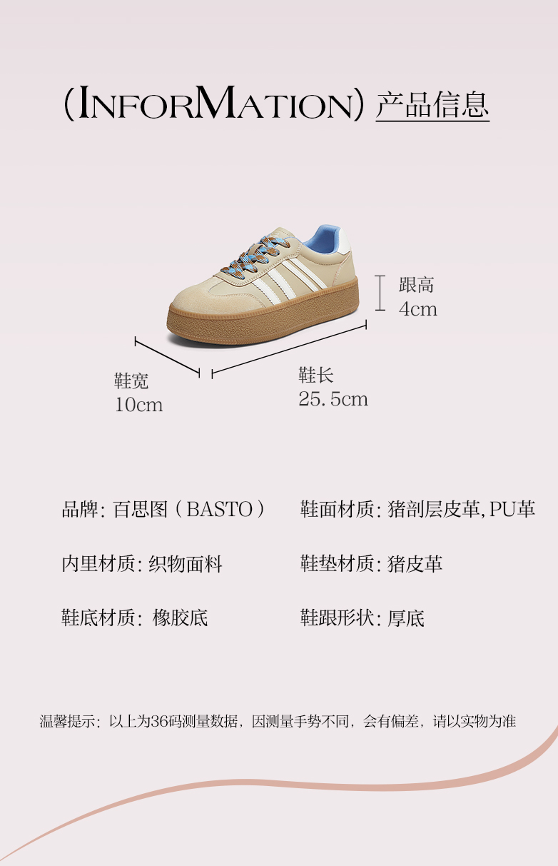 BASTO(百思图),品牌拥有17年历史,秉承优雅、甜美、清新的设计理念,主张“好嫁风”的产品风格,将甜美俏丽的少女情怀融合优雅气质的时尚品味,塑造出唯美优雅、受欢迎的女鞋款式。主打以女性温柔与亲和力为特色的流行时尚产品,糅合雅致又富有亲和力的裸粉色调,淑媛端庄、清新甜美。目前品牌已开设线下门店达1400多家。