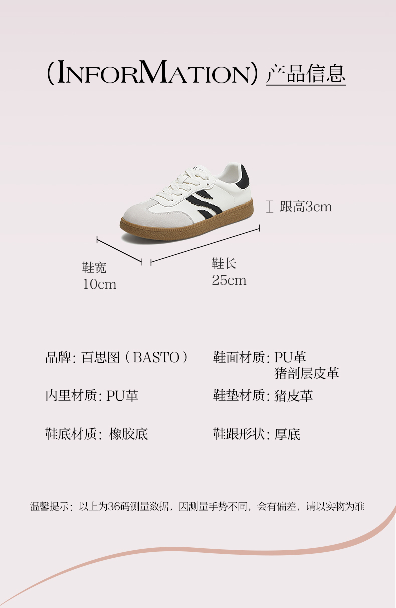 BASTO(百思图),品牌拥有17年历史,秉承优雅、甜美、清新的设计理念,主张“好嫁风”的产品风格,将甜美俏丽的少女情怀融合优雅气质的时尚品味,塑造出唯美优雅、受欢迎的女鞋款式。主打以女性温柔与亲和力为特色的流行时尚产品,糅合雅致又富有亲和力的裸粉色调,淑媛端庄、清新甜美。目前品牌已开设线下门店达1400多家。